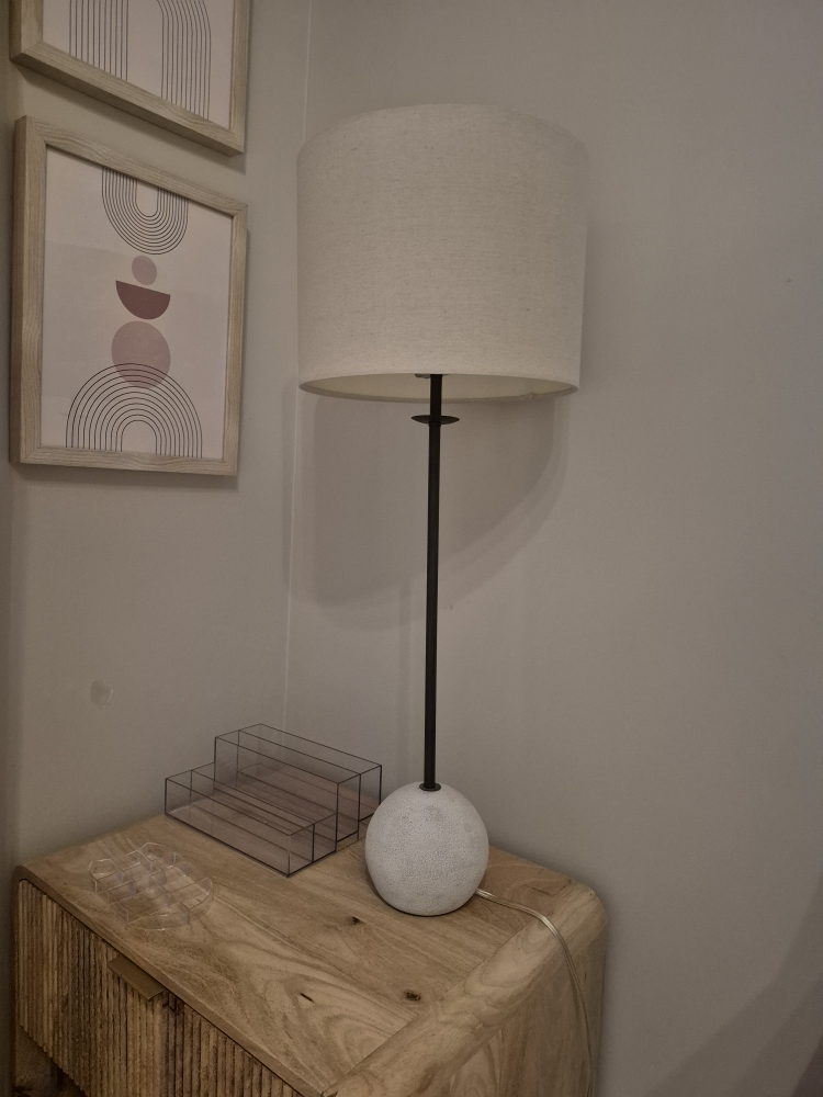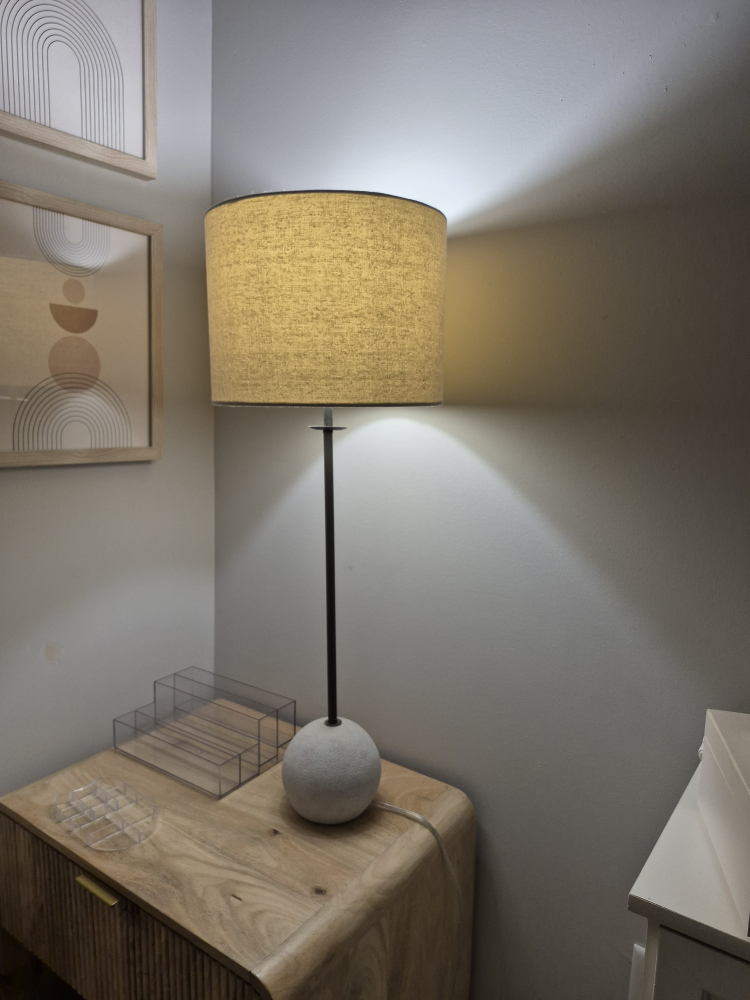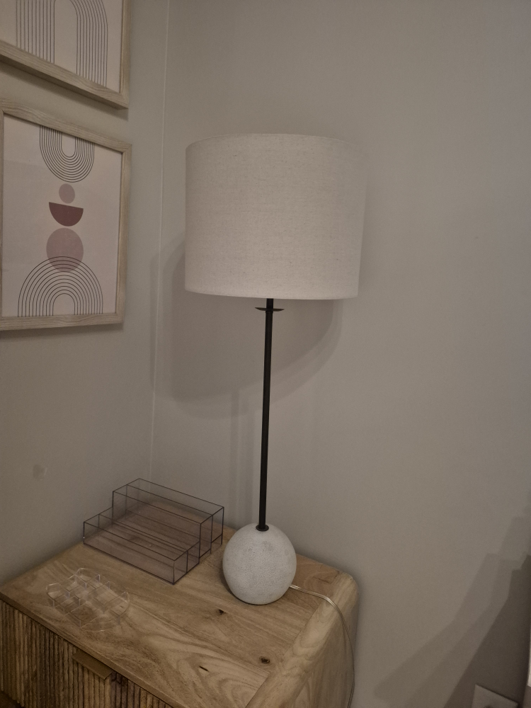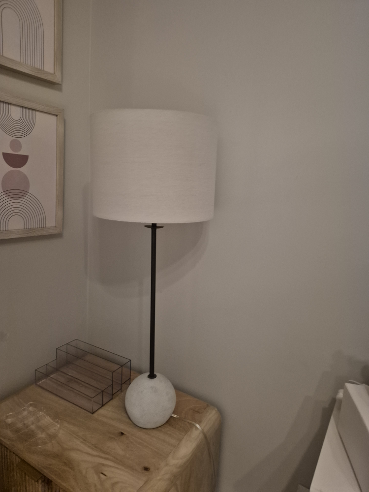 Selling a modern floor lamp with a white shade. It has a sleek black pole and a round, textured base.