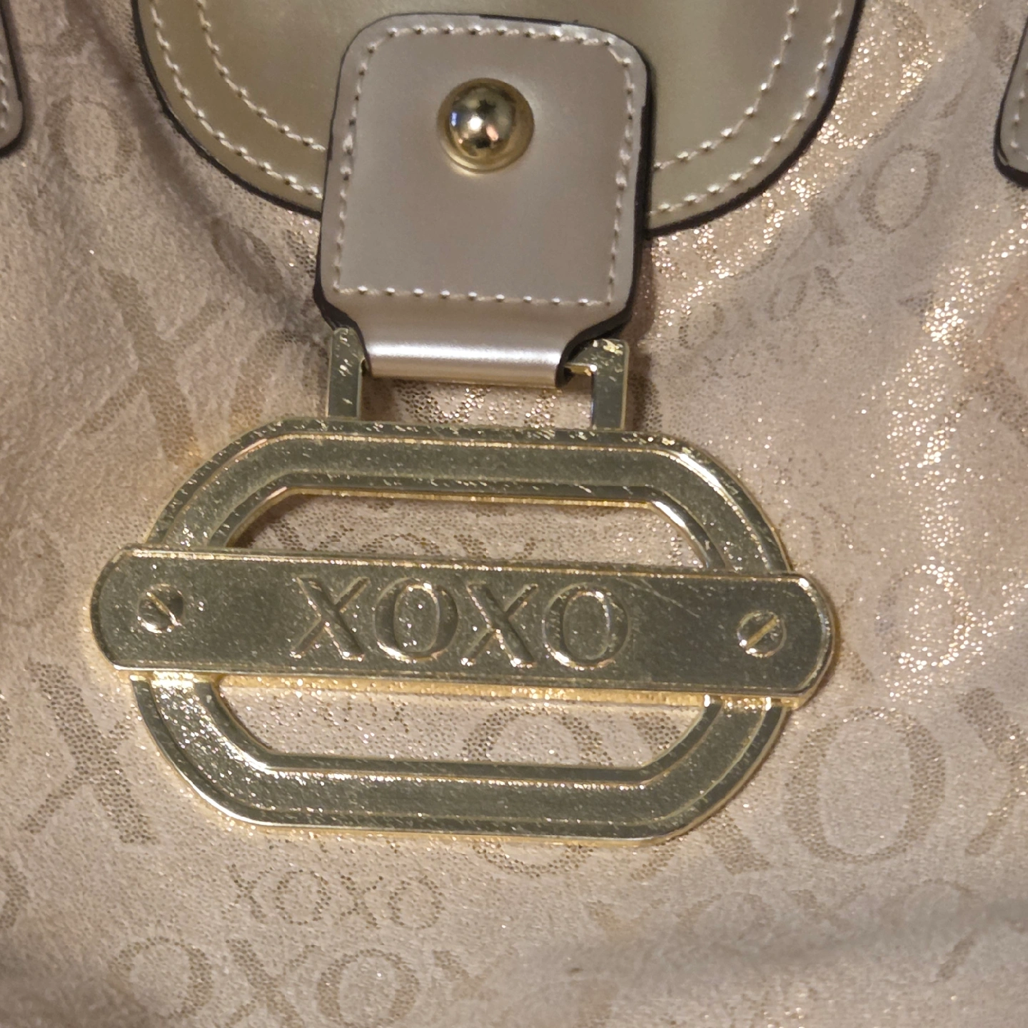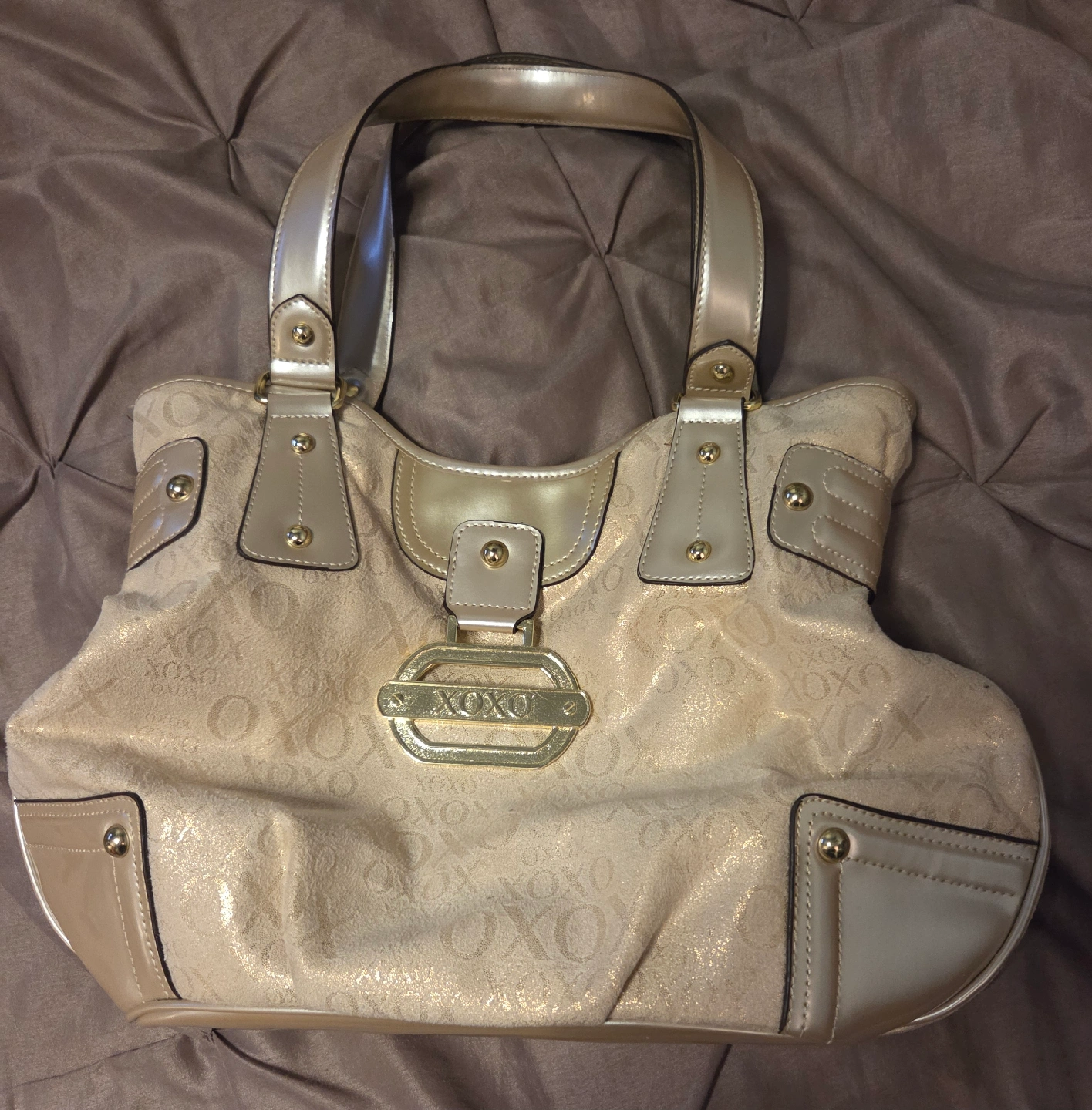 119Selling a XOXO purse in a gold colour. It's in good condition and has a unique design with the XOXO logo patterned throughout.