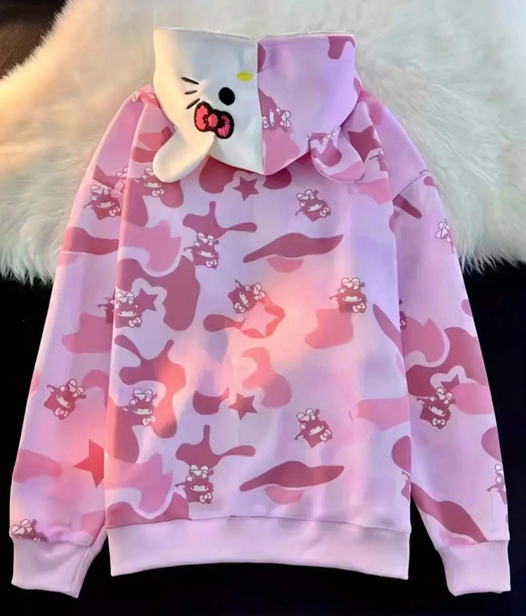 Selling a super cute Hello Kitty zip-up hoodie! It features a fun pink camouflage pattern with Hello Kitty designs throughout. The hood has Hello Kitty's face on one side and a matching pink camo on the other. It's in great condition and ready for a new home!