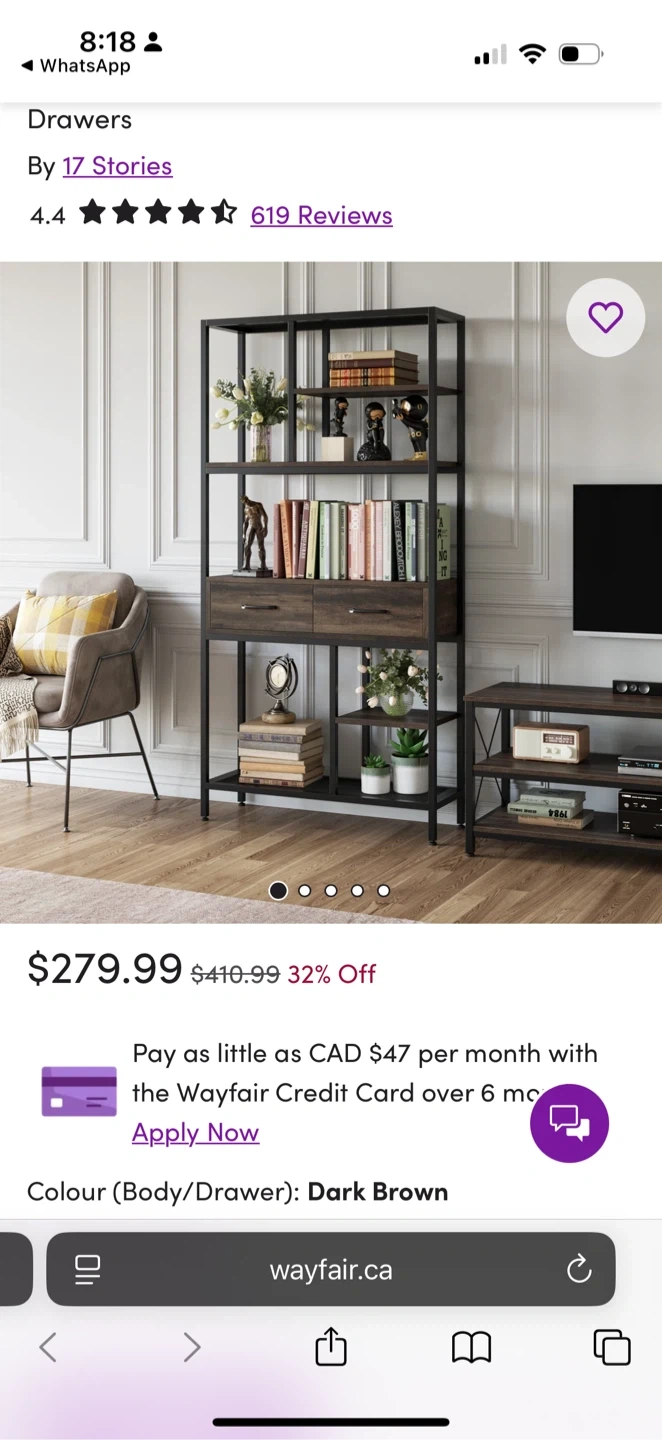 This is a stylish bookshelf from Wayfair! It features a dark brown finish on both the body and drawers. Originally bought for $350, it's in great condition and ready to find a new home. Perfect for adding storage and display space to any room. Brand new