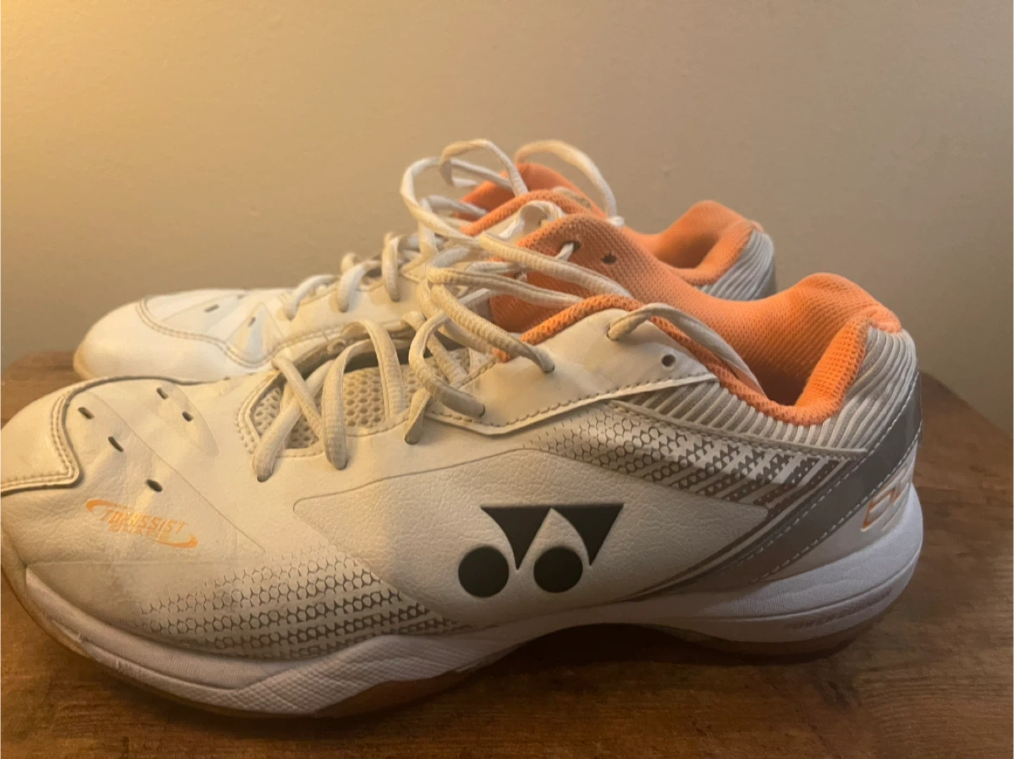 Selling a pair of Yonex badminton shoes in US women's size 10. These are white with orange accents and feature a non-marking rubber sole. Perfect for badminton or other indoor sports!