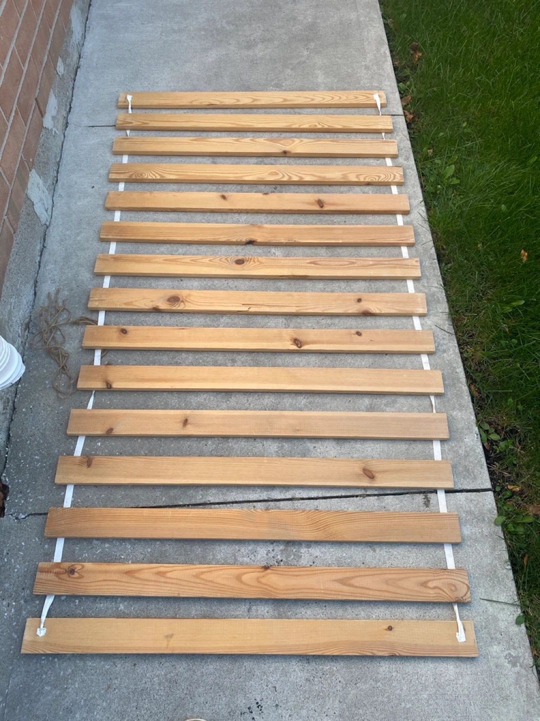 Selling a full set of wooden bed slats! They're in good condition and ready to support your mattress. Each slat measures approximately 70 inches in length the price is $20 sometimes the add automatically prices on its own but it’s $20