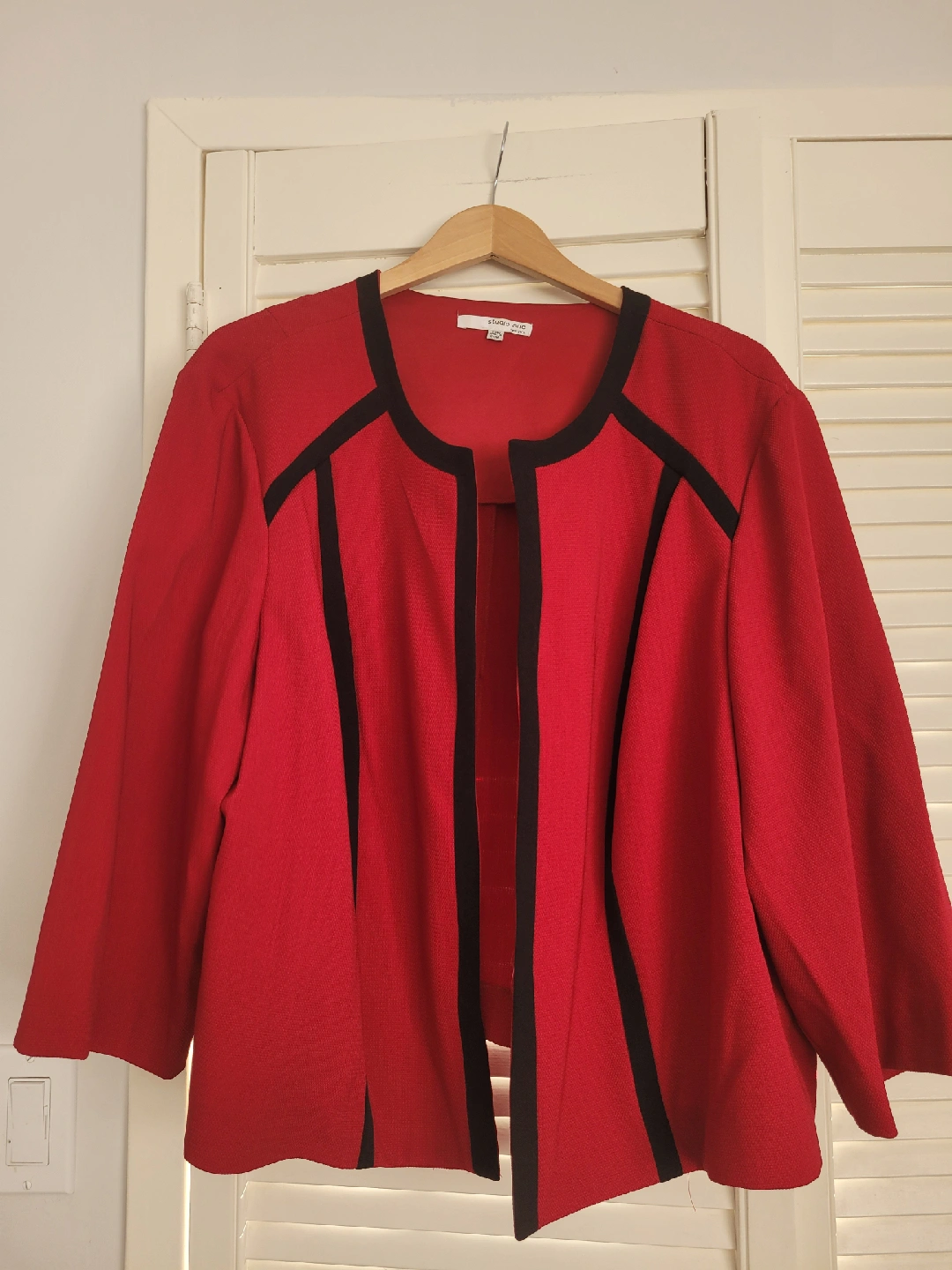 Selling a stylish blazer in a vibrant red colour! It features a unique design with black accents. Perfect for adding a pop of colour to your wardrobe and can be dressed up or down. It's in great condition and ready for a new home