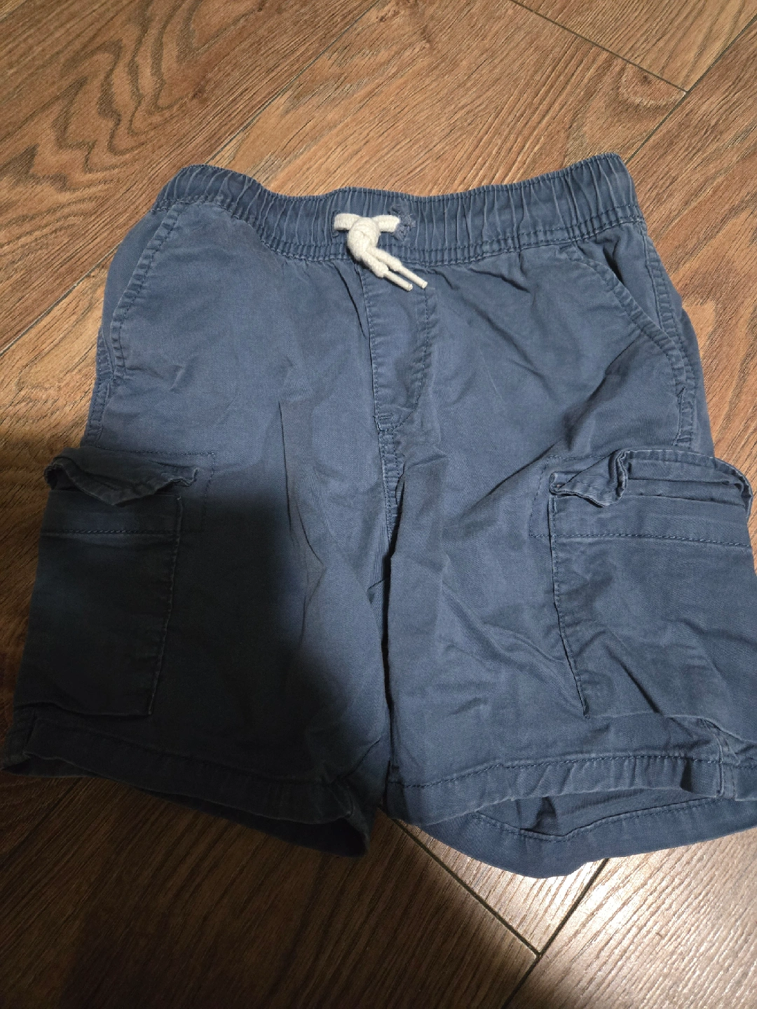 These are a pair of blue cargo shorts. They have an elastic waistband with a drawstring and cargo pockets on the sides. They are in good condition and ready for a new home! S/P (6)