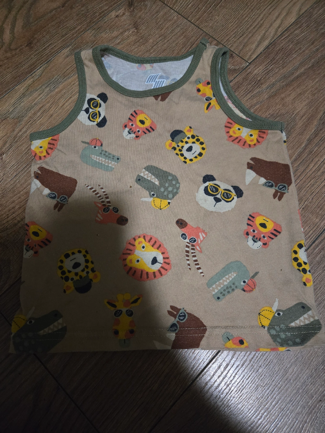 Selling a cute tank top with an all-over animal print! The background is a light tan colour, and it features a variety of animals wearing sunglasses. Perfect for a little one!size 18 to 24m