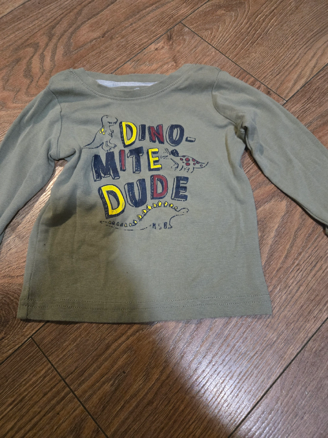 A cute long-sleeve shirt with a 'Dino-mite Dude' design! It's perfect for your little one to wear during cooler days. There are some signs of wear. size 18 to 24m