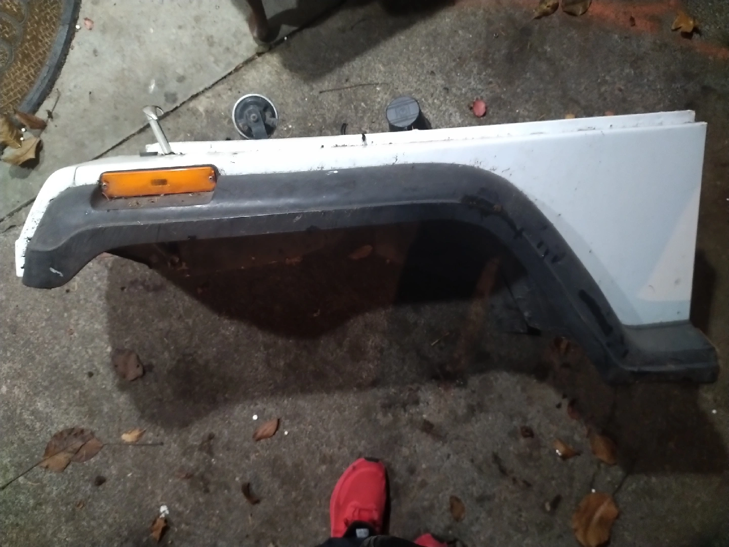 Selling a white fender flare for a Jeep Wrangler. It appears to be in used condition with some wear and tear. Perfect if you need a replacement!