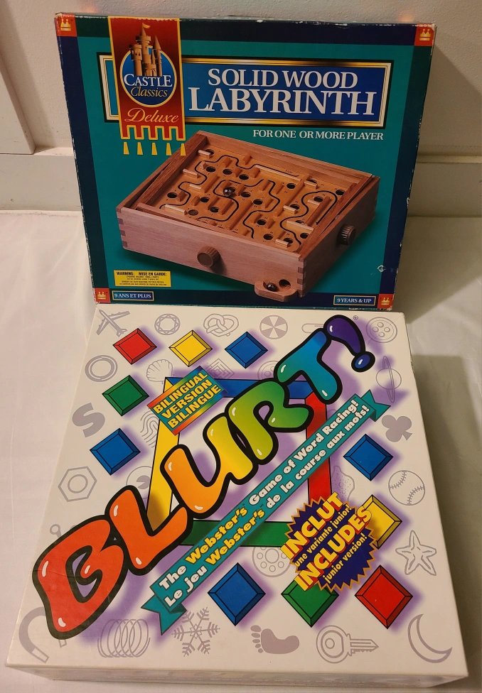 Blurt! The Webster's Game of Word Racing and Castle Classics Deluxe Solid Wood Labyrinth. Blurt! is a bilingual version, with a junior version included.
