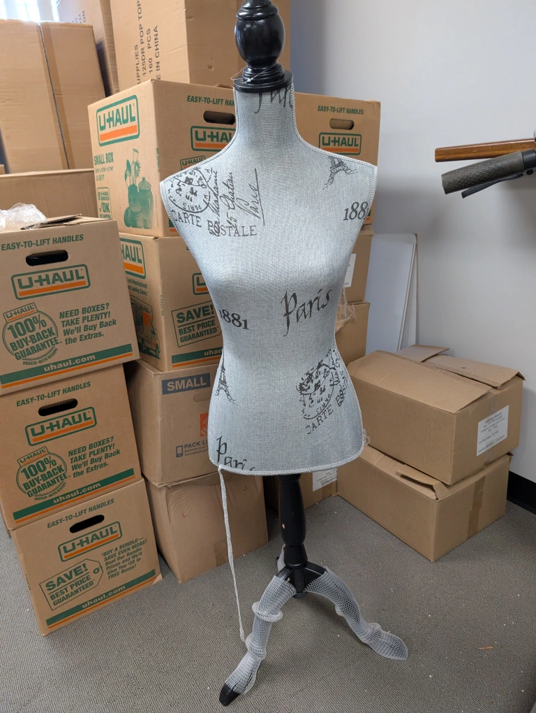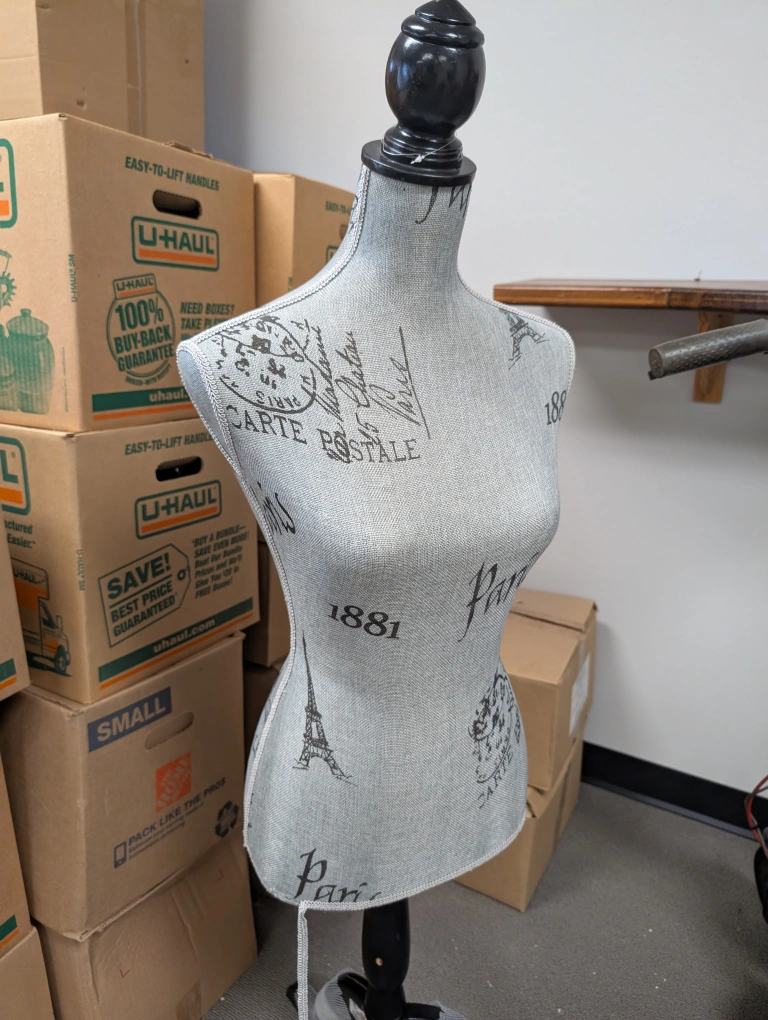 Selling a decorative mannequin with a Paris theme. It features details like 'Carte Postale' and 'Paris' printed on the fabric. It's a unique piece to add to your decor
