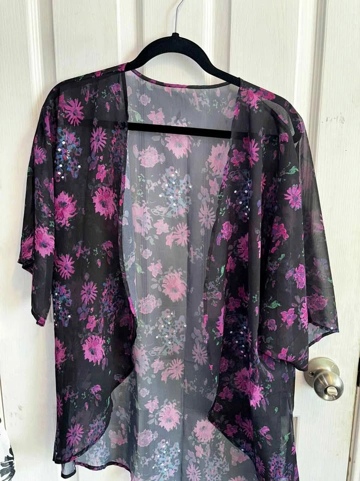 Lightweight sheer kimono with vibrant purple & pink floral print. Perfect layering piece for summer outfits, beachwear, or casual chic looks.