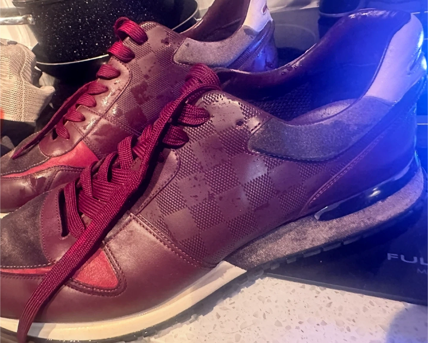 Louis Vuitton burgundy leather sneakers in good condition. These stylish sneakers feature the iconic LV monogram pattern. They have a comfortable fit and are perfect for adding a touch of luxury to your everyday look Size 12 no try ons