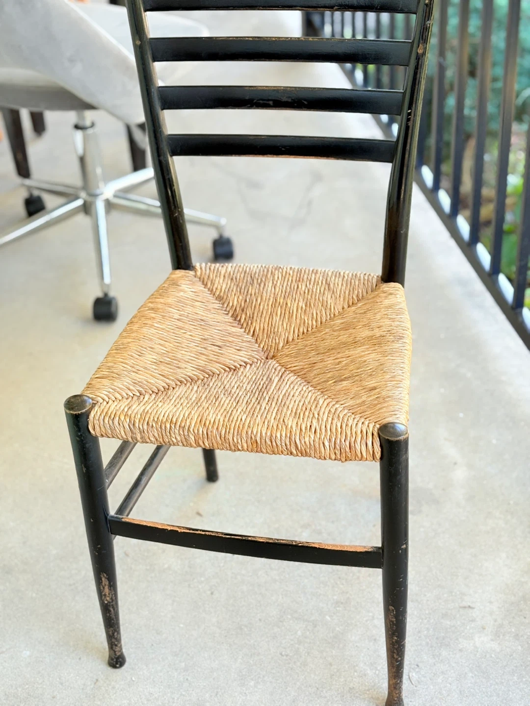 Selling a chair with a woven seat and black frame. It has some signs of wear, as shown in the photos, but it's still sturdy and has a lot of charm. Perfect for adding a rustic touch to your home!