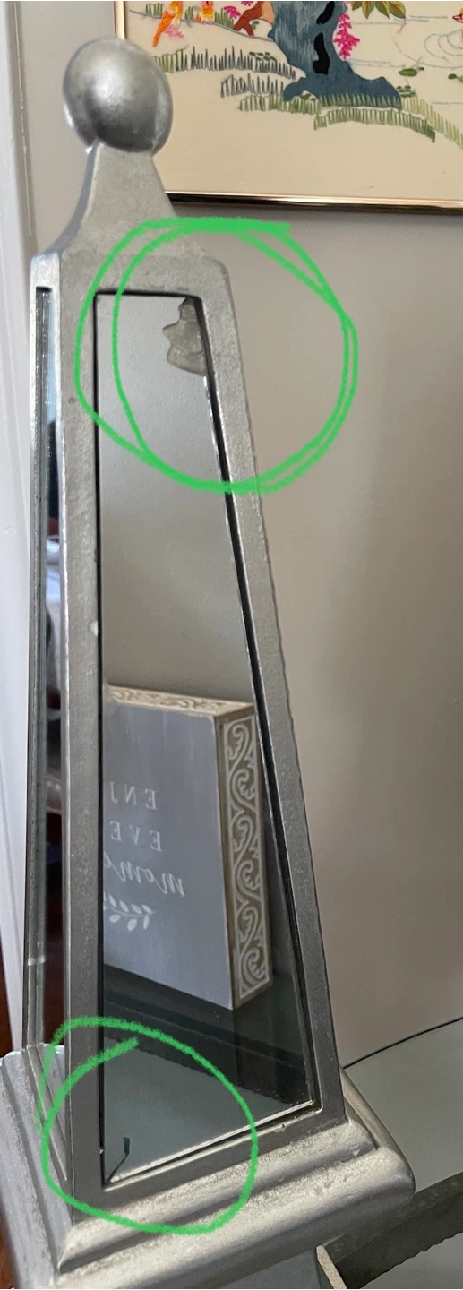 Add a touch of elegance to your home with these silver tabletop ornaments! Included are a Big Ben replica, an obelisk mirror, and a stack of books! They're in great condition and ready to brighten up any space Tall tower has a couple of defects.