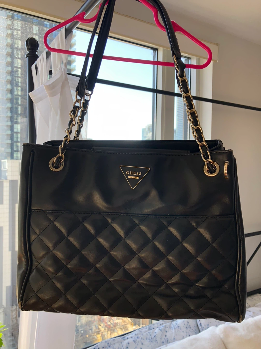 419Selling a Guess black quilted tote bag! It has gold chain detailing on the straps and the classic Guess logo. Inside, there are multiple compartments to keep your belongings organized. Perfect for adding a touch of elegance to any outfit