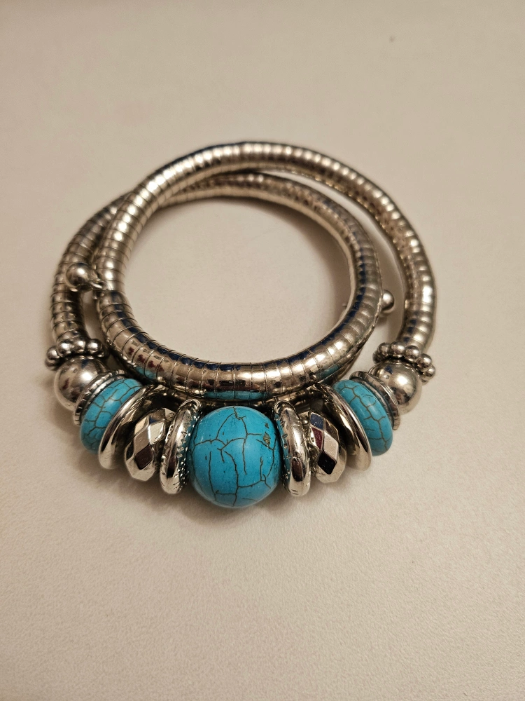 355Here's a lovely silver-tone bangle bracelet! It features a wrap design and is adorned with beautiful turquoise-coloured beads. It's in great condition and ready to add a pop of colour to your outfit You can use it as a necklace too!