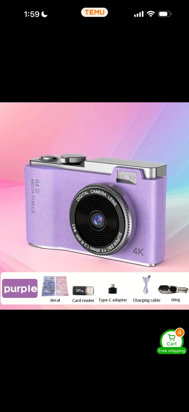 Selling a brand new purple 64.0 Mega Pixels 4K digital camera! It comes with a decal, card reader, type-c adapter, charging cable, and sling. The camera is still in its original box.