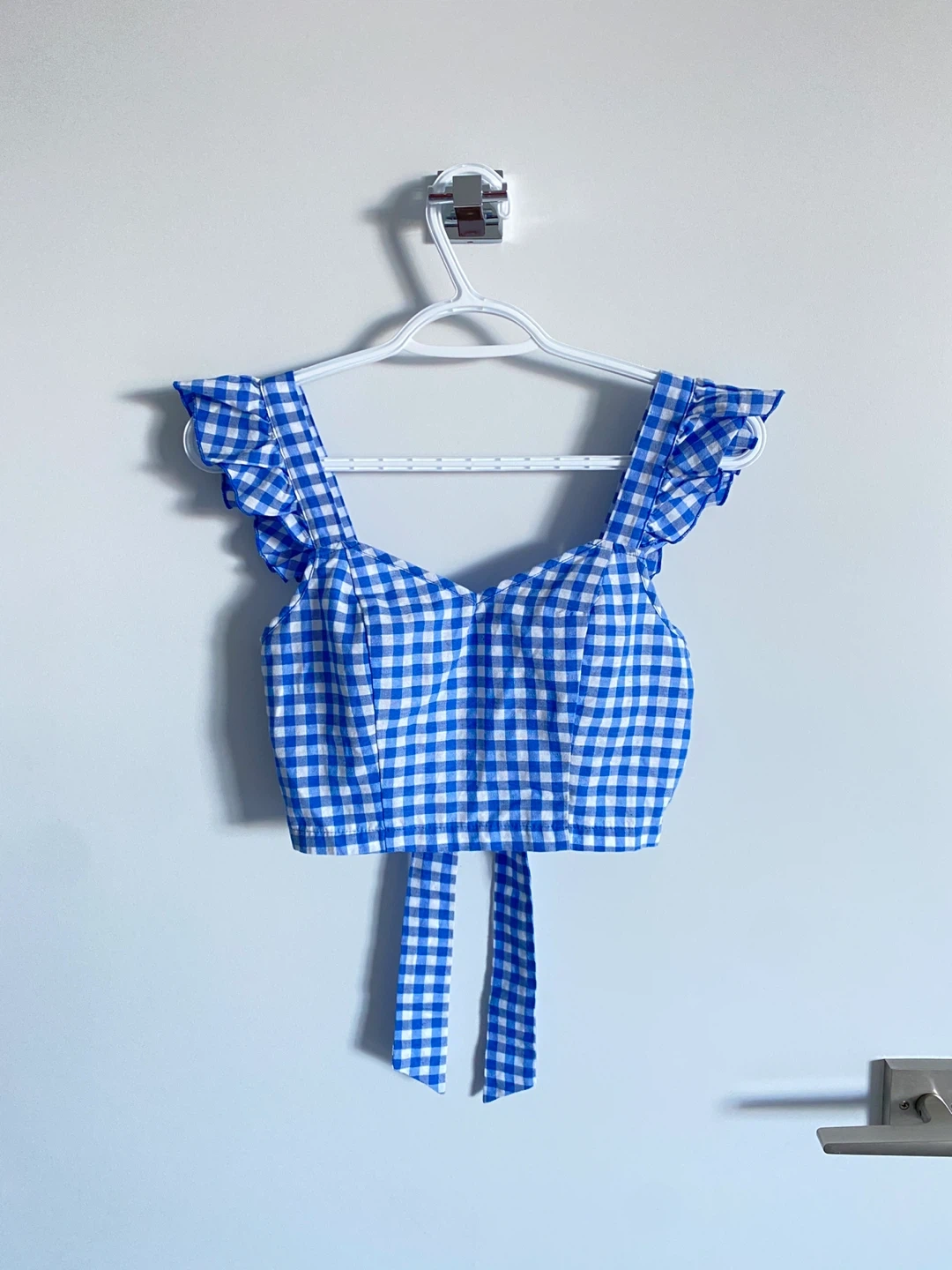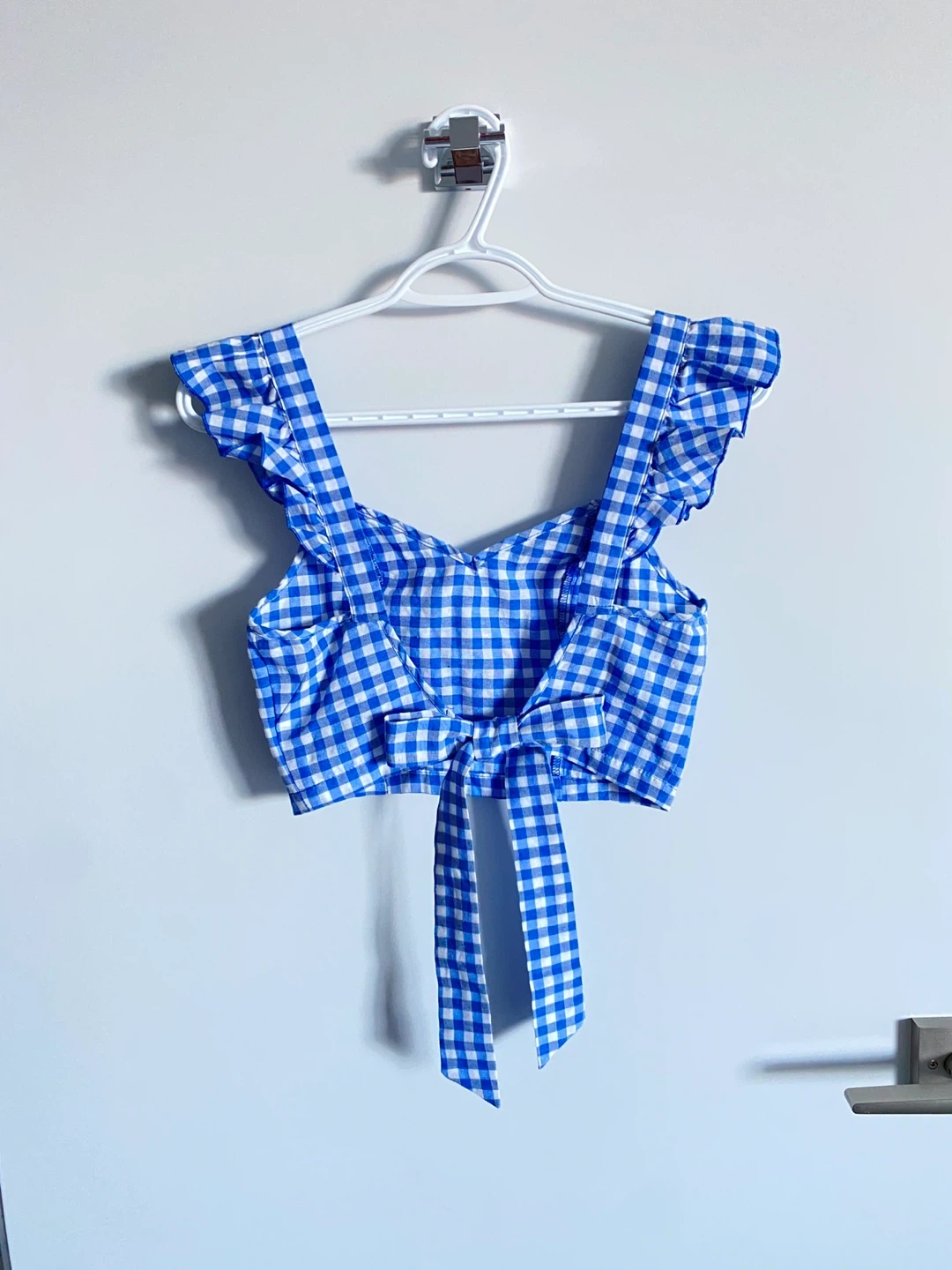 Cute blue checkered print top with bow detailing on the back! Its has beautiful ruffles on the sleeves and flattering V neckline with darts that will creates a beautiful silhouette. Can be paired with anything and looks very feminine. Size small. Never worn condition. ❤️ Check out my other listings for great deals!