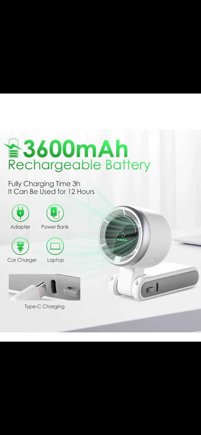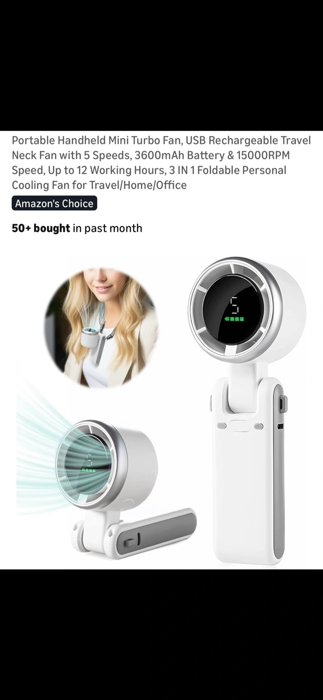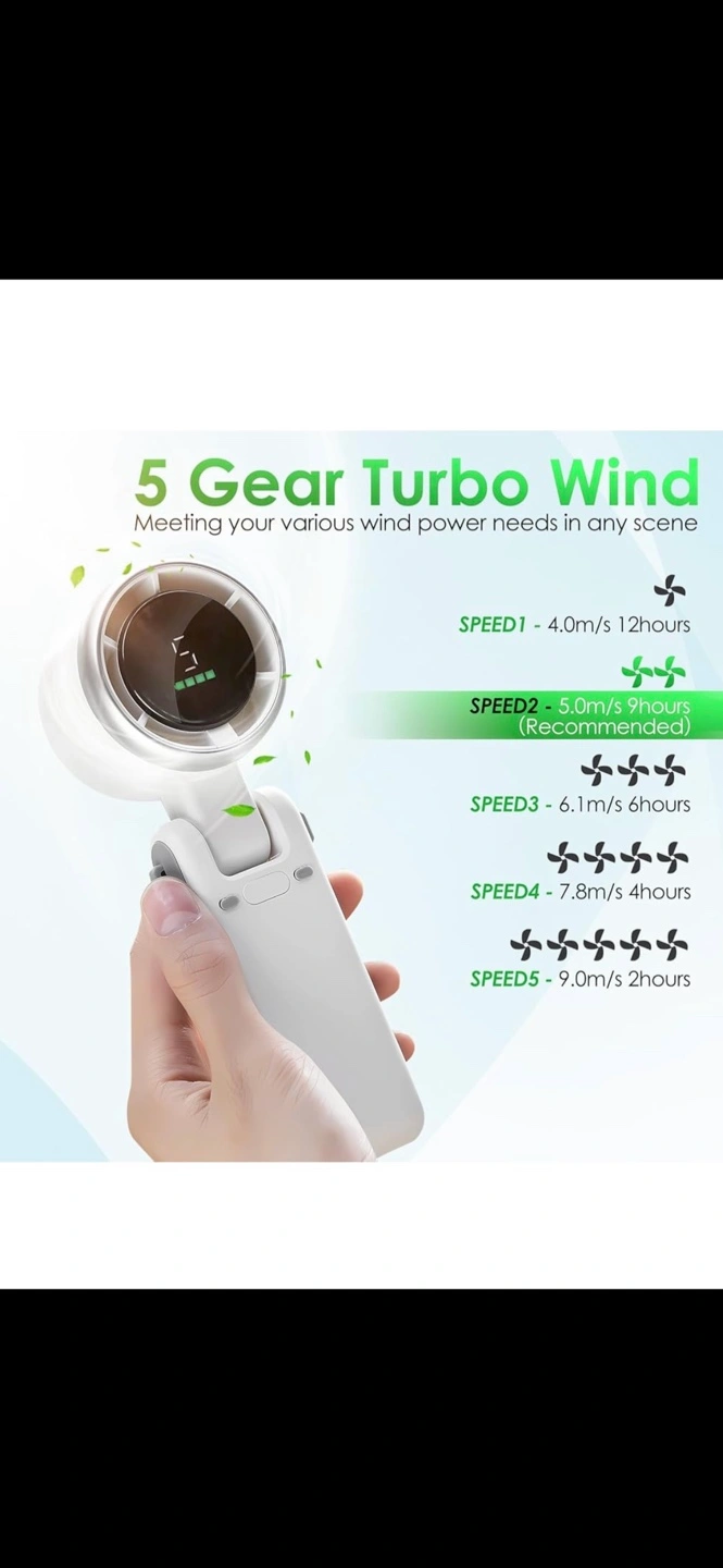 I'm selling a portable handheld mini turbo fan! It's USB rechargeable, perfect for travel. It has 5 speeds, a 3600mAh battery, and can reach 15000RPM. It can be used for up to 12 hours when fully charged. It can also be used as a power bank!