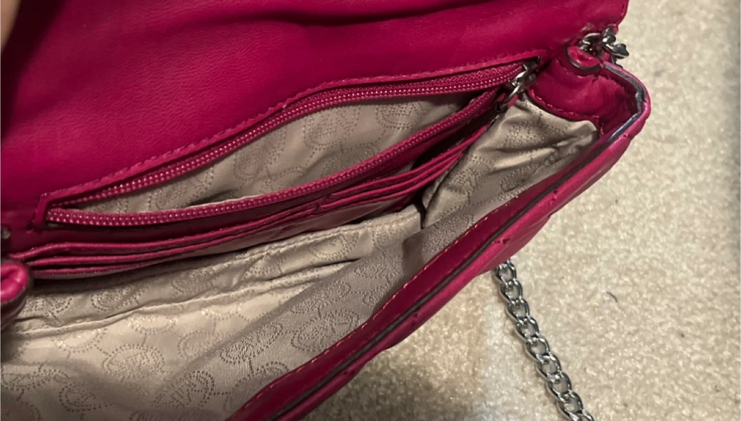 Interior has 2 zipper pockets and multiple card slots. External pocket on back. Chain strap can be made shorter as a shoulder bag or longer to be a crossbody.