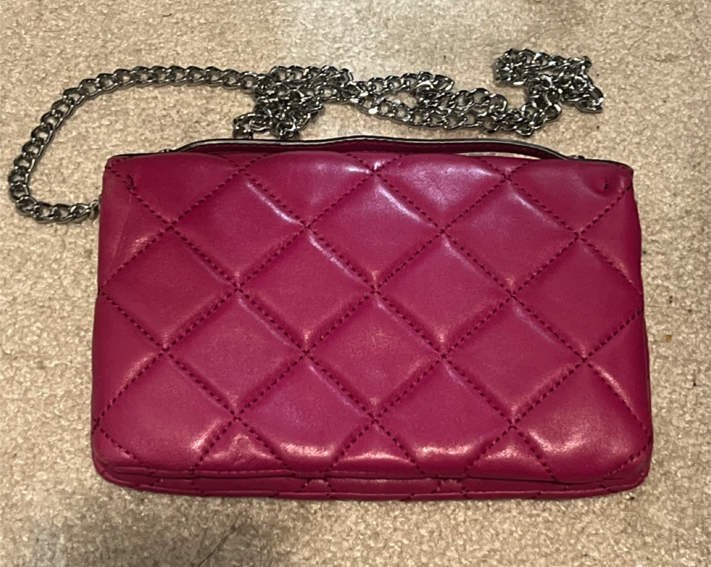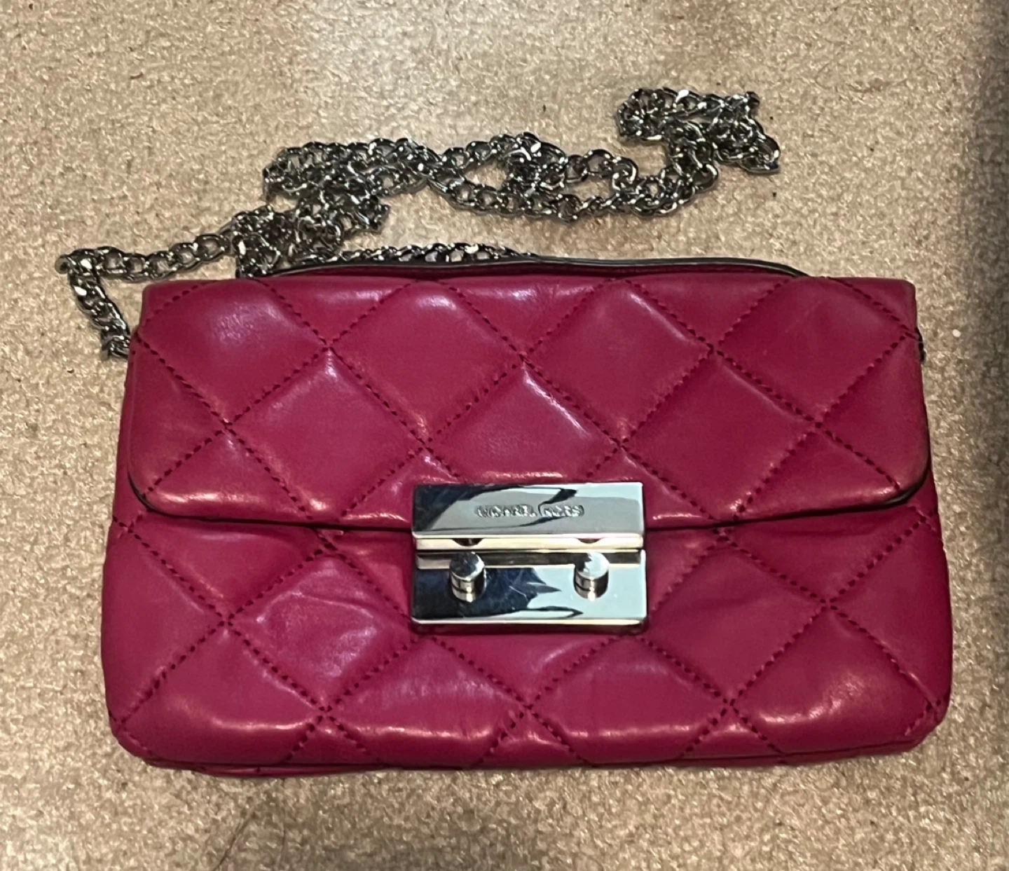 Selling a stylish Michael Kors crossbody bag! It features a beautiful pink quilted leather design and a silver chain strap. It's perfect for adding a pop of colour to any outfit. The interior has a zipper and card slots.