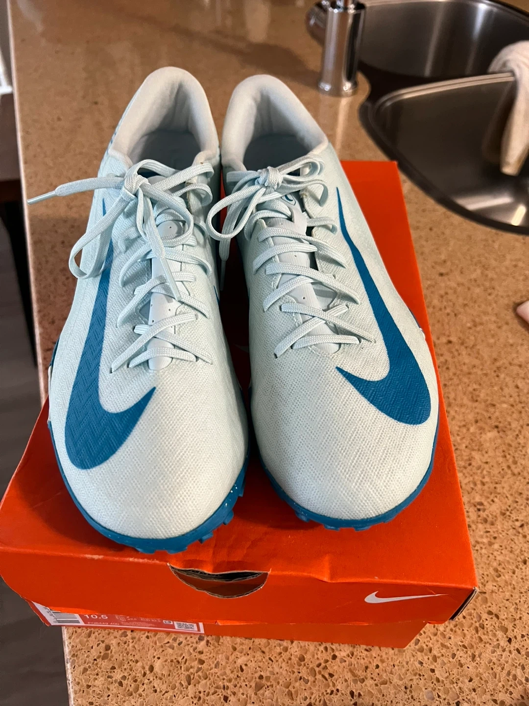 Selling a pair of Nike Zoom Vapor 16 Academy TF soccer shoes in men's size 10.5. The colour is Glacier Blue/Blue Orbit. These are in great condition and come with the original box