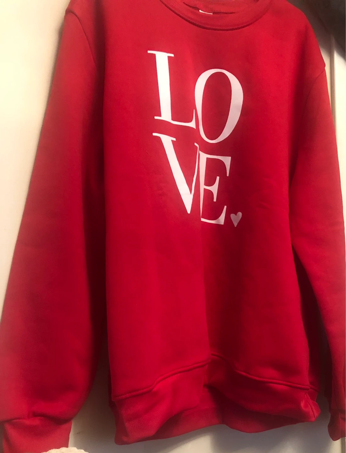 A comfy red crewneck sweatshirt with a "LOVE" graphic and a small heart accent. It's made from a soft material, perfect for casual wear. Great for Valentine's Day or any day you want to share some love!