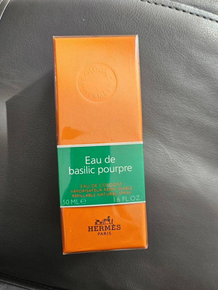 Selling a bottle of Hermès Eau de basilic pourpre. It's a refillable natural spray that comes in a 50mL (1.6 fl.oz) bottle.