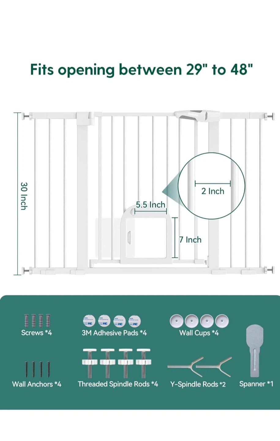 New sealed in box Selling a Babelio baby/pet gate that fits openings between 29" to 48"! It's in great condition and comes with all the necessary components for installation. - Screws - 3M Adhesive Pads - Wall Cups - Wall Anchors - Threaded Spindle Rods - Y-Spindle Rods - Spanner Keeps your little ones or furry friends safe and secure