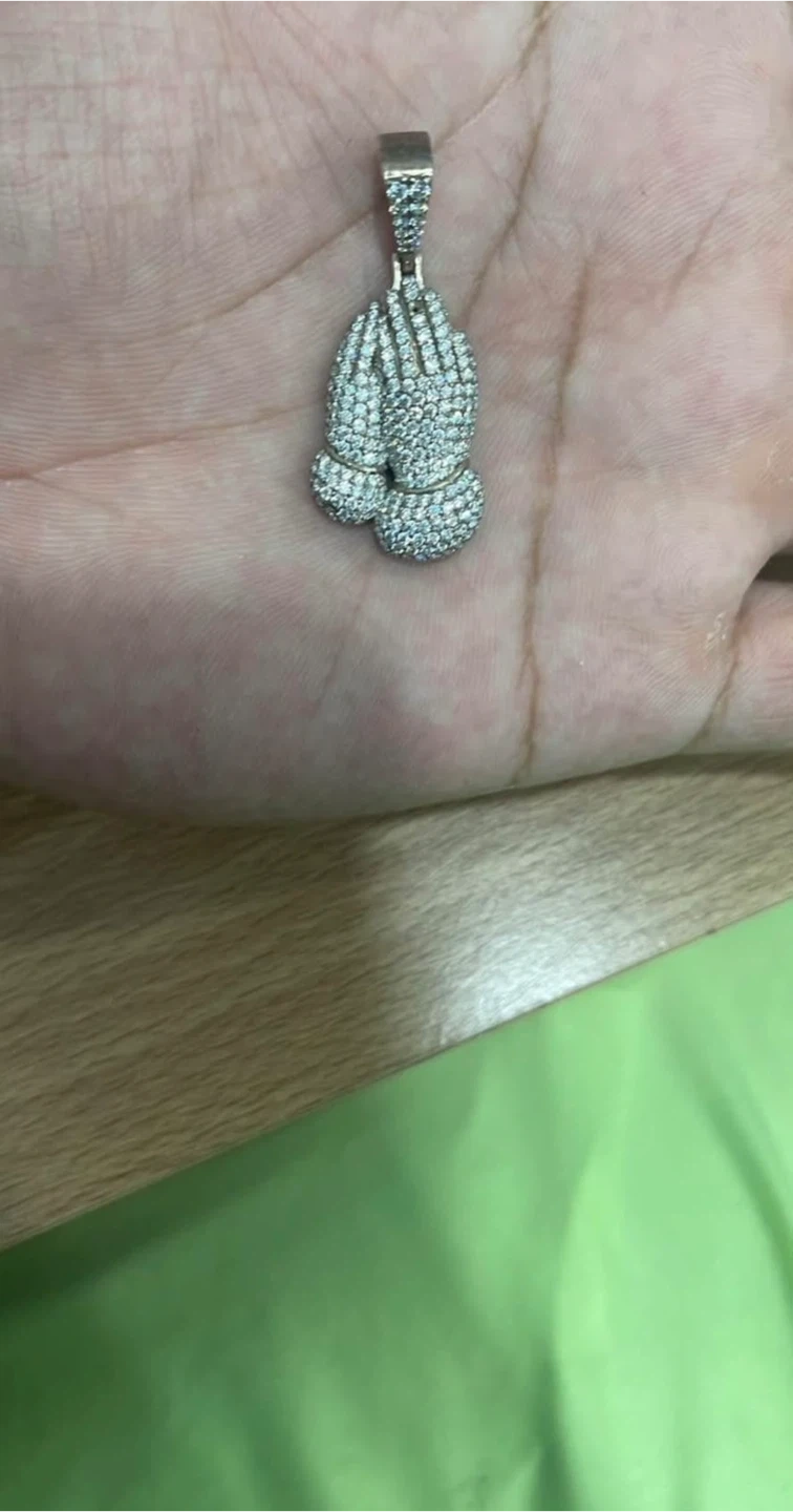 Selling a praying hands pendant. The pendant is silver coloured and decorated with small crystals. It would be a nice addition to any outfit!