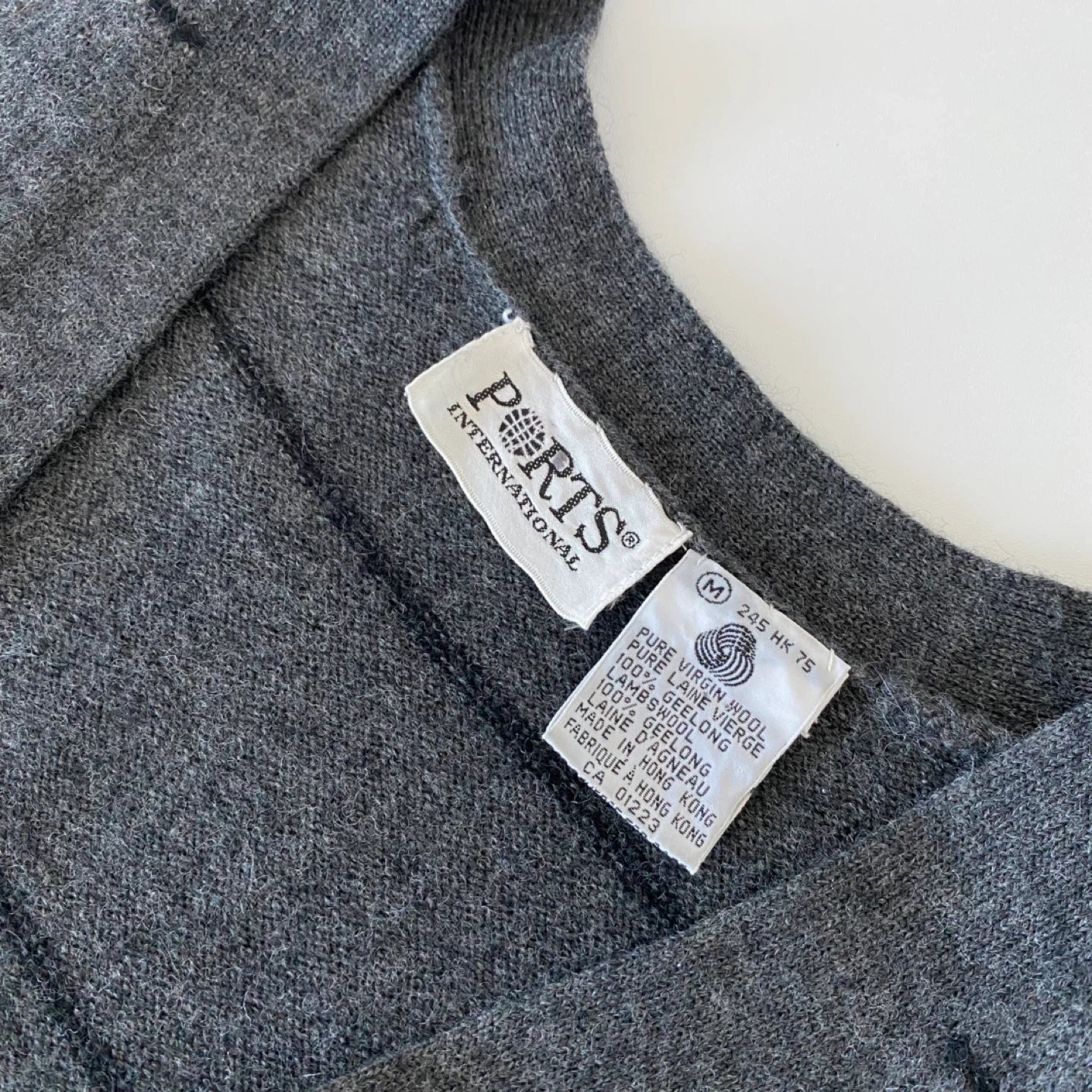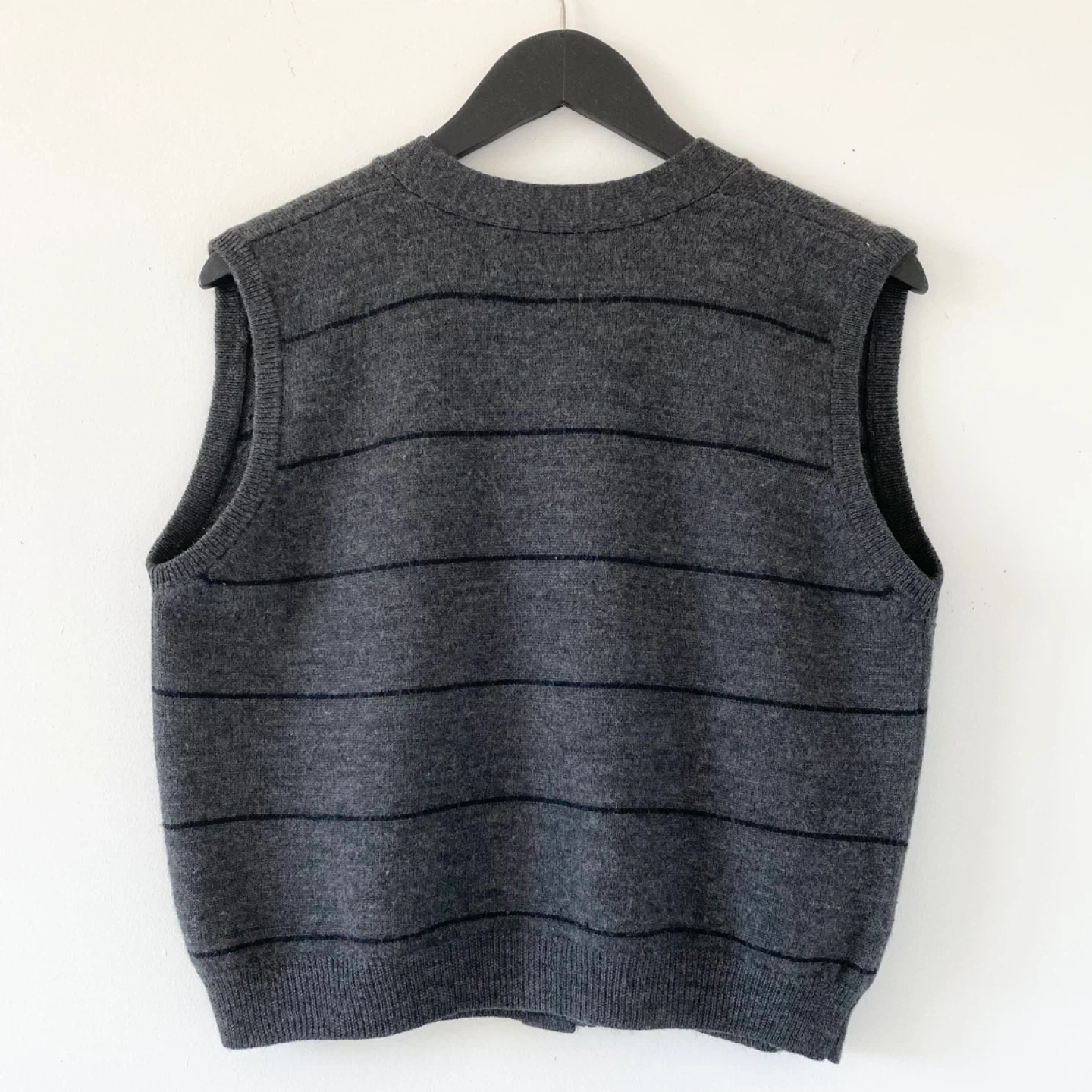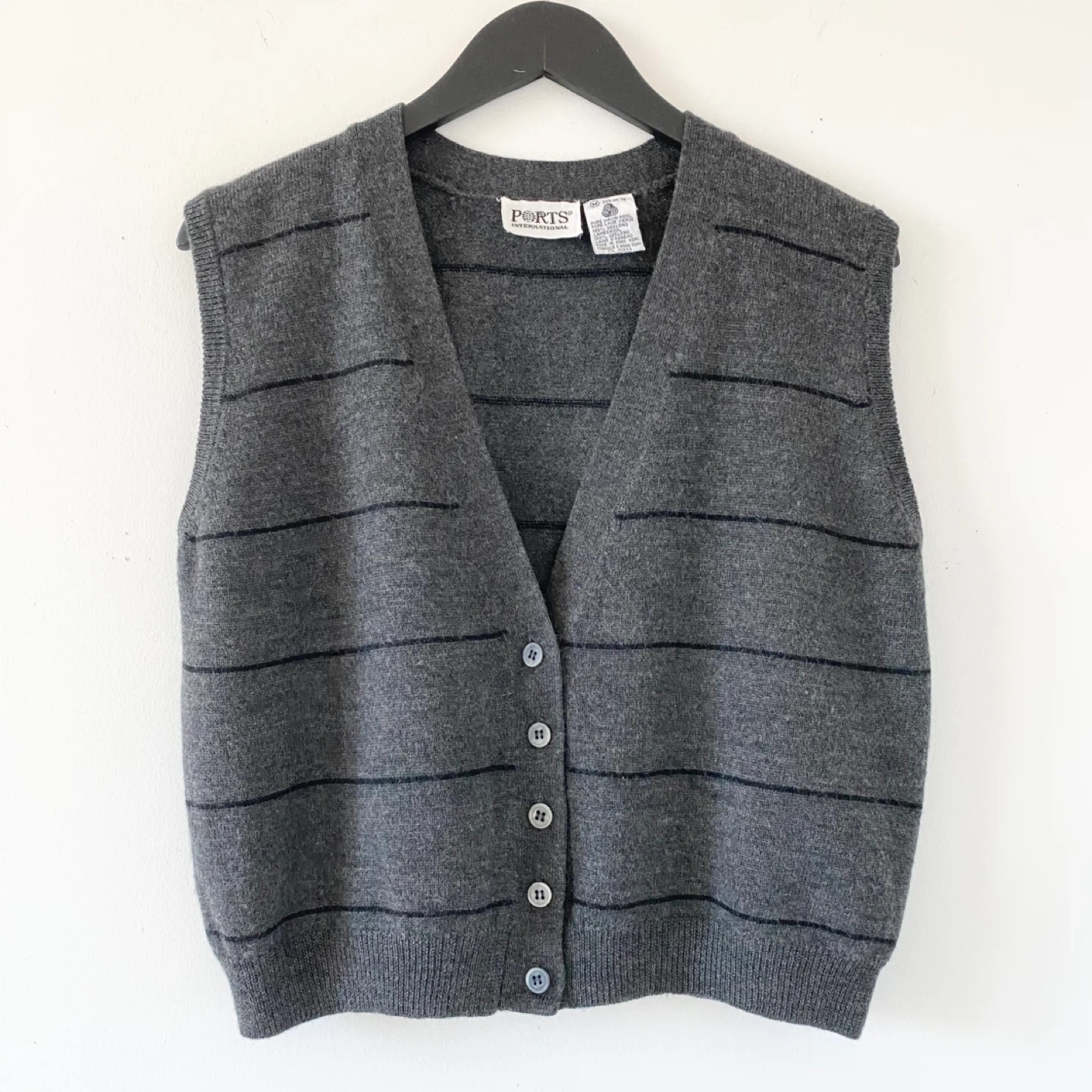 615Pick up only in Leslieville (Queen and Pape) Check out other listings! Vintage Ports v-neck vest. Made of light to medium weight 100% virgin wool in dark grey and black stripes. There were small holes which have been mended as per the last pics. They are barely noticeable. Otherwise there's no staining or pilling. It's clean and in great condition. Size M Approximate measurements laid flat Shoulder 16.75” Pit to pit 20.5” Center back length 20”