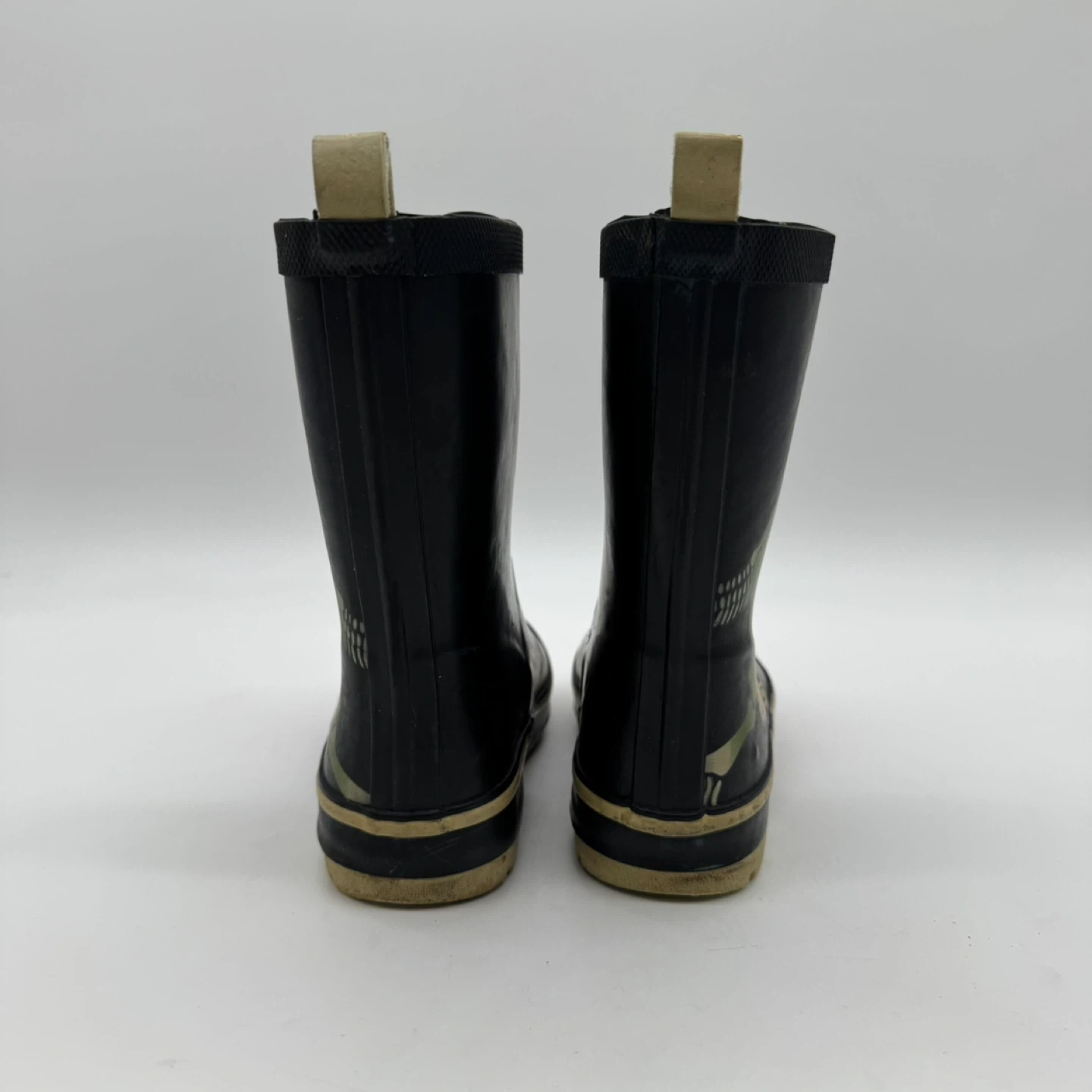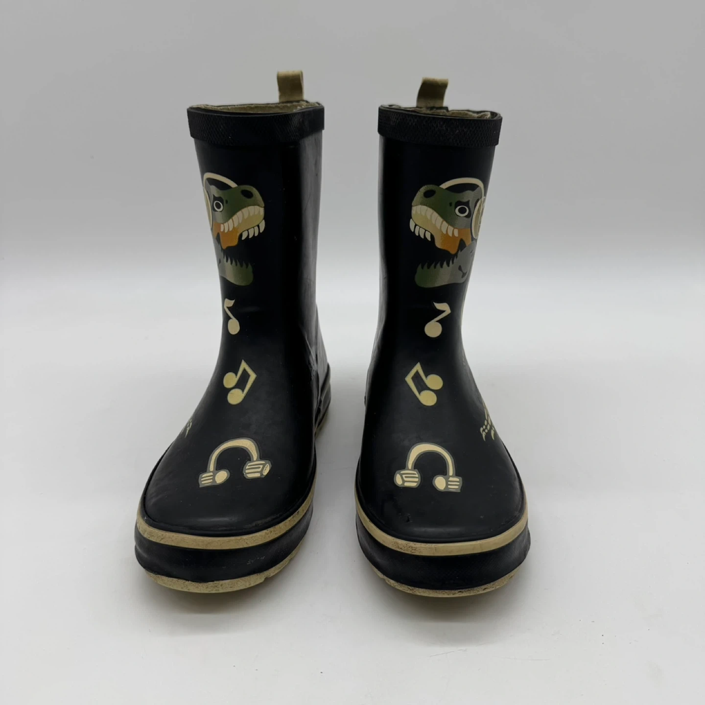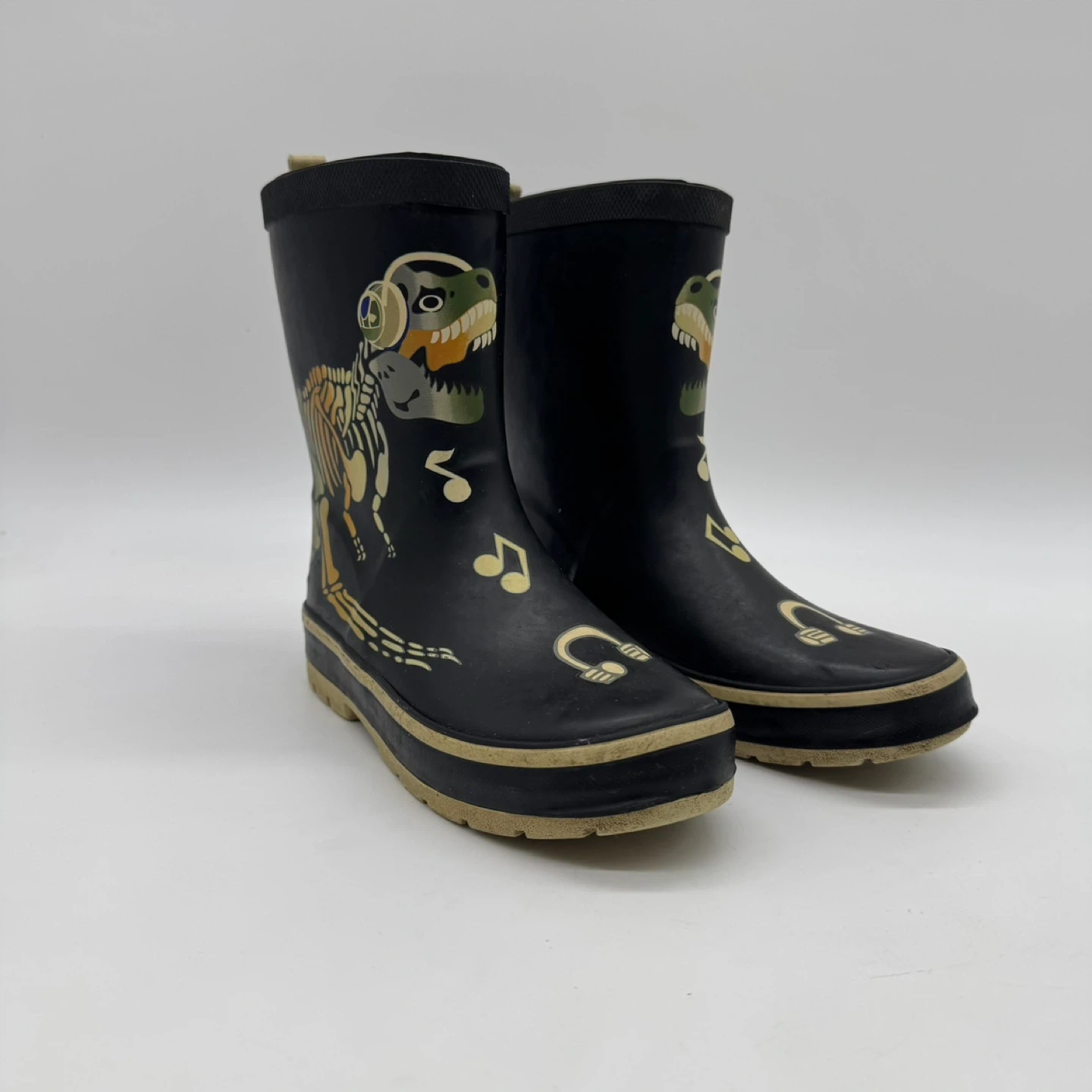 Fun and stylish kids' rain boots featuring a cool dinosaur skeleton wearing headphones with music notes print.