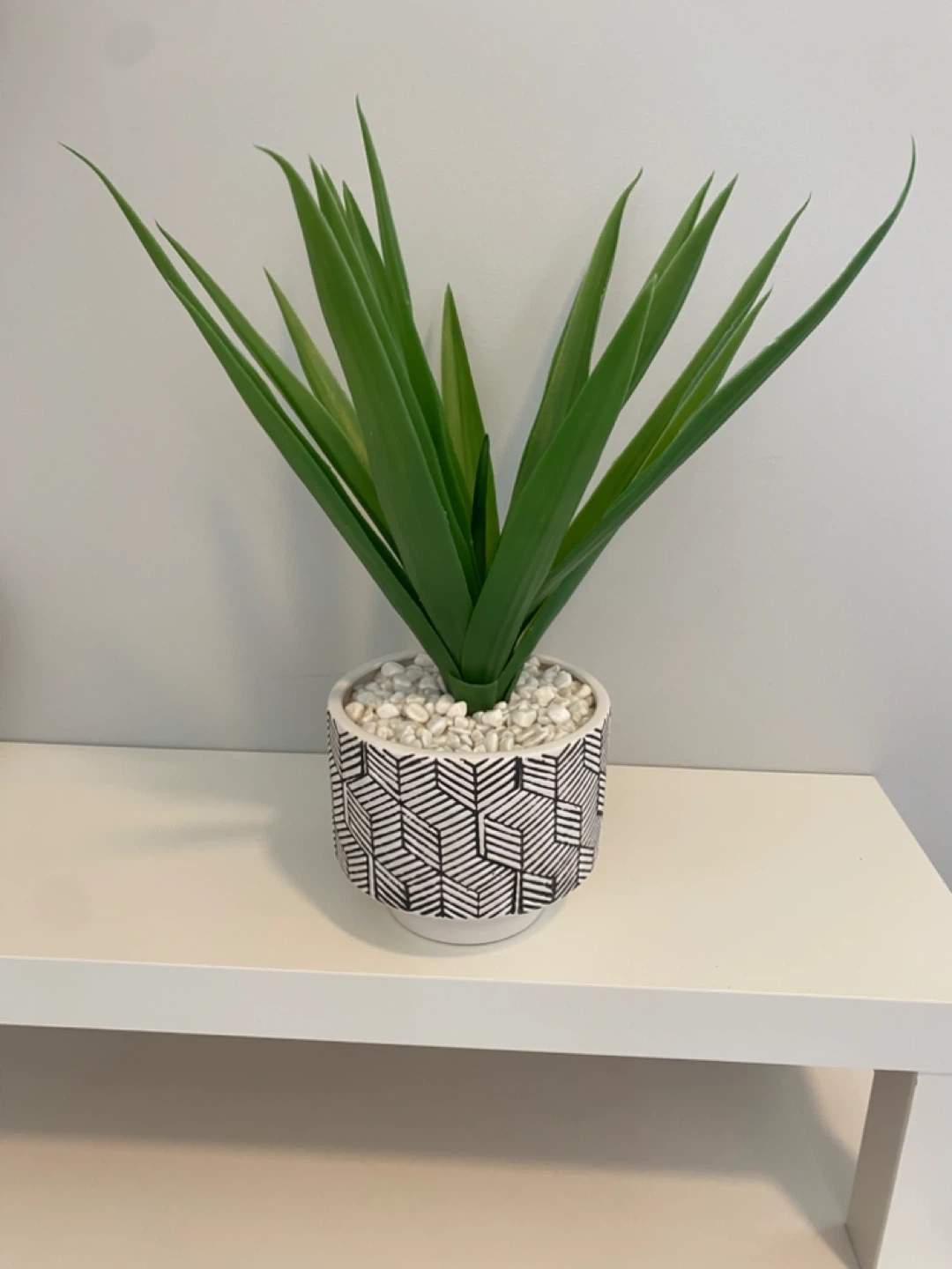 AGAVE - Here's a lovely artificial plant from Homesense! It features vibrant green leaves and a stylish black and white patterned pot filled with white stones. The original price tag on the bottom says $24.99