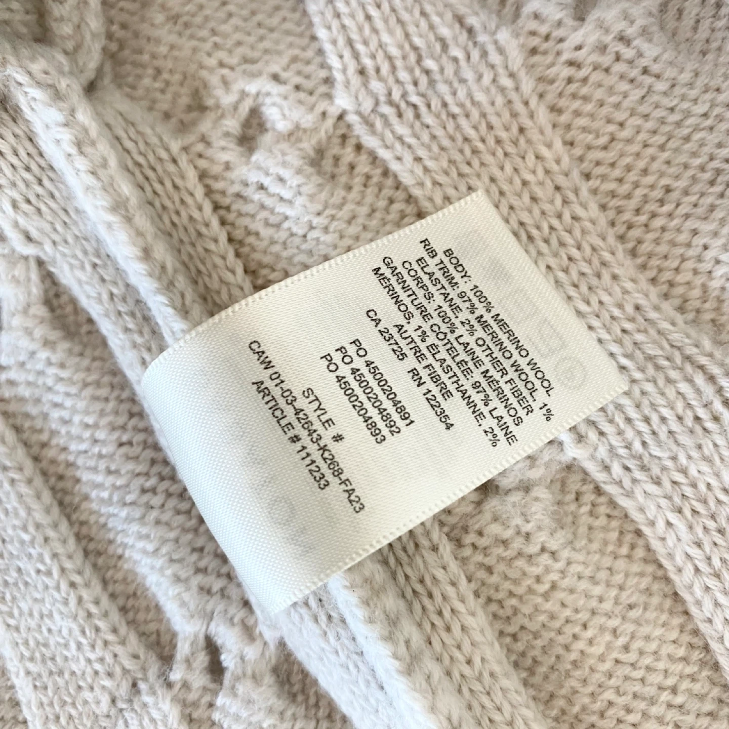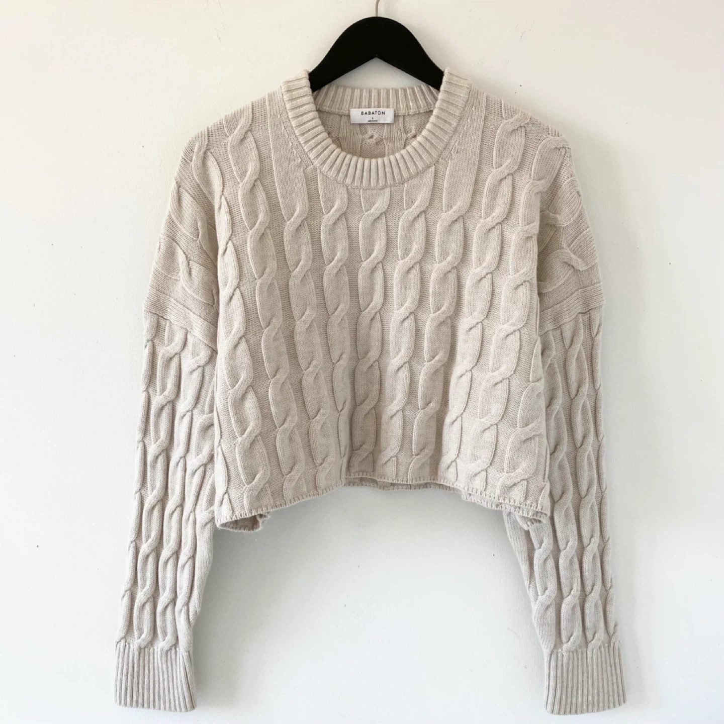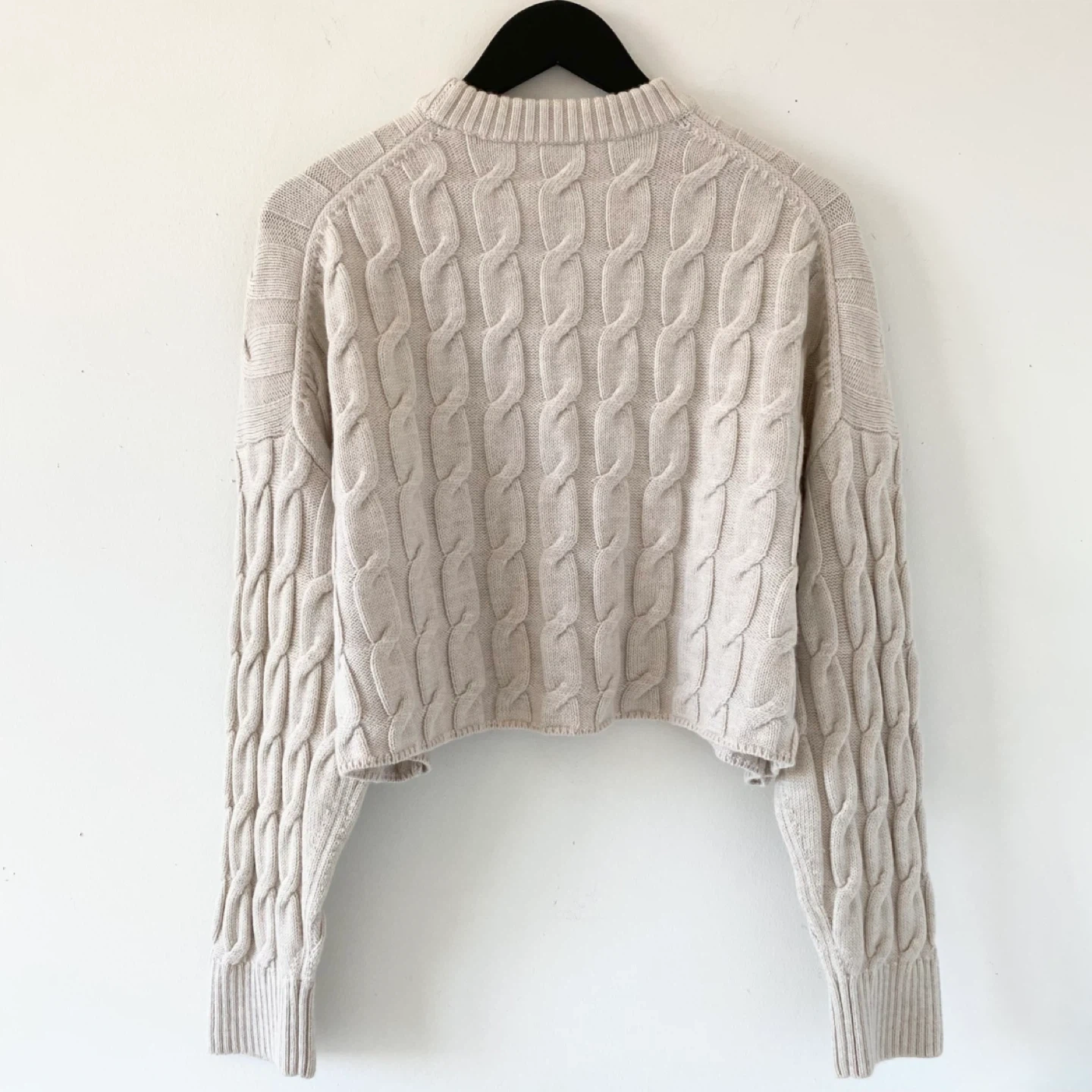 615Pick up only in Leslieville (Queen and Pape) Check out other listings! This is a fully fashioned crewneck, cropped sweater with dropped shoulders and ribbed trim at the neckline and cuffs. It’s knit with Embrace Merino - extra-fine 100% merino wool yarn coveted for its natural warmth and super soft feel. There's no staining, pilling or damage. It's clean and in excellent condition. Size L Approximate measurements laid flat Shoulder (dropped) 26.5” Pit to pit 27” Shoulder to cuff 18” Center back length 18.25”