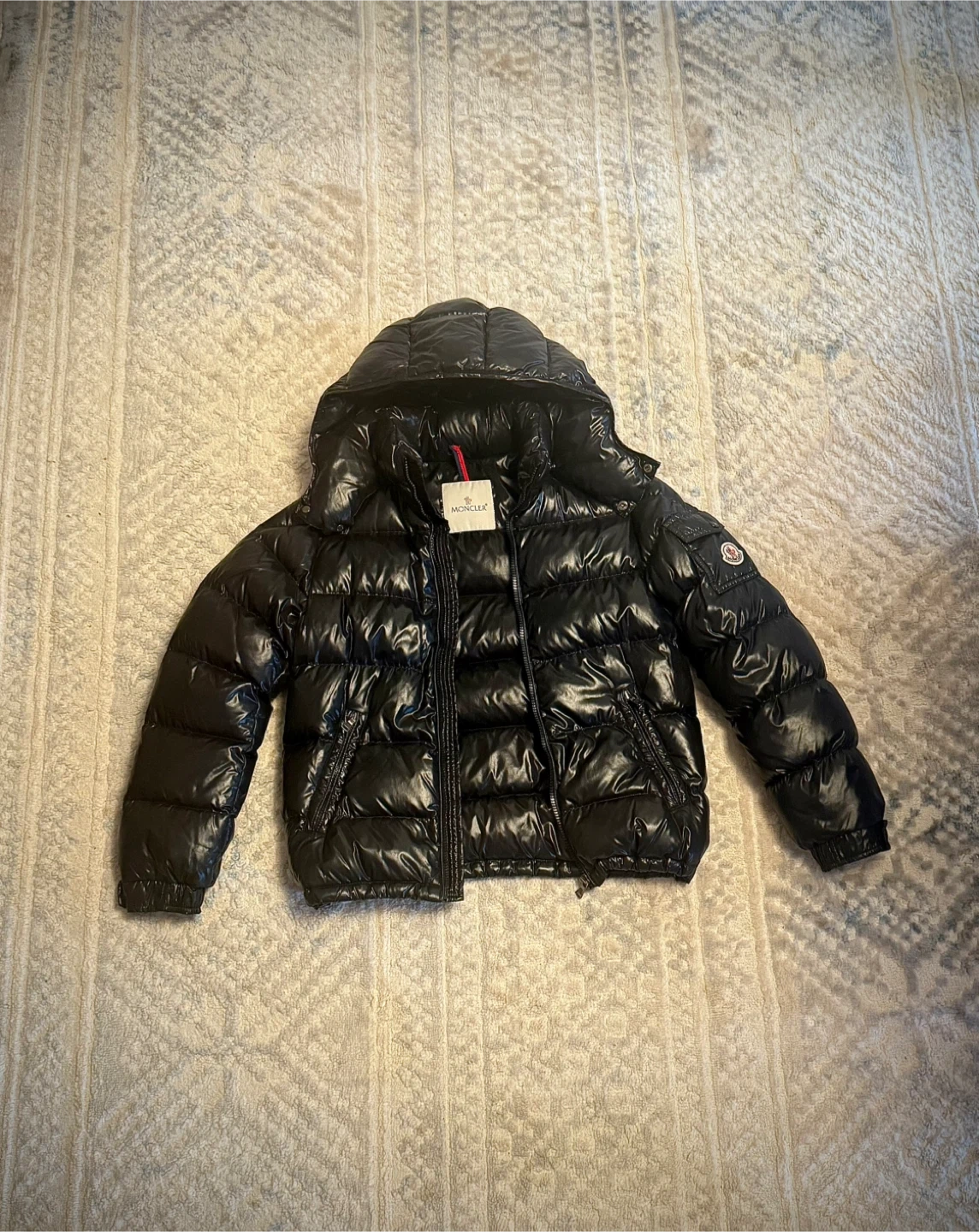 Selling a Moncler black padded down jacket! This stylish and warm jacket is perfect for the colder months. It features a hood and the classic Moncler logo on the sleeve. Feel free to reach out if you're interested