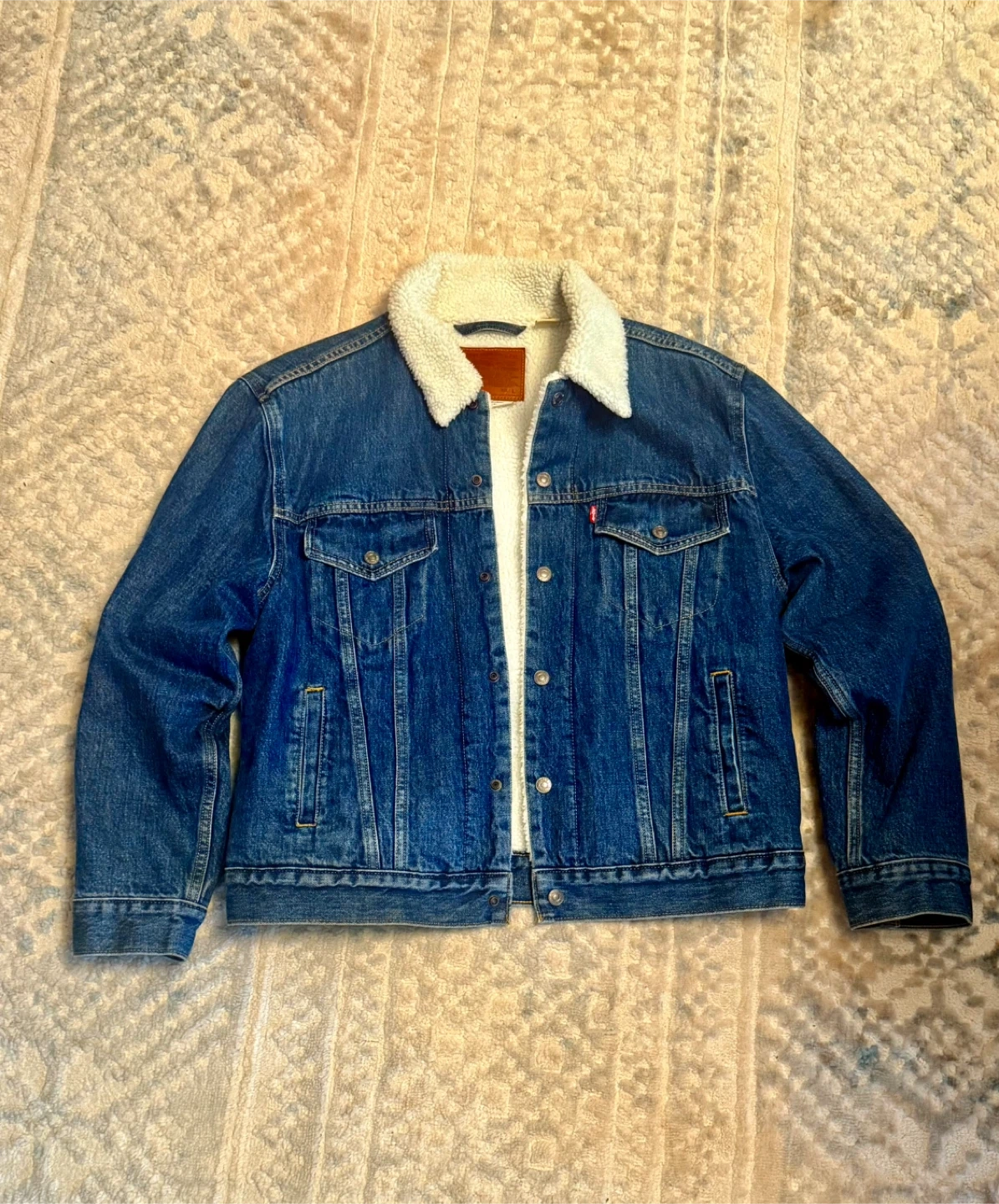 I'm selling a Levi's Sherpa Trucker Jacket in a denim blue color! It's a classic style that’s perfect for cooler weather. The sherpa lining adds extra warmth and comfort