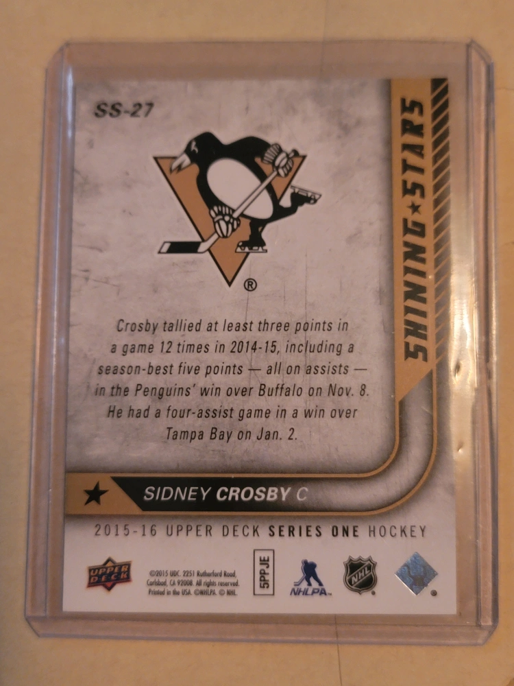 Selling a Sidney Crosby hockey card from the 2015-16 Upper Deck Series One Hockey collection! The card is in great condition and features Crosby in his Penguins jersey. A must-have for any hockey fan or card collector