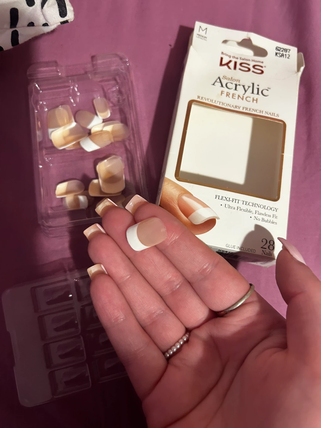 a set of KISS Salon Acrylic French Nails. They are revolutionary French nails with Flexi-Fit Technology, offering an ultra-flexible and flawless fit with no bubbles.