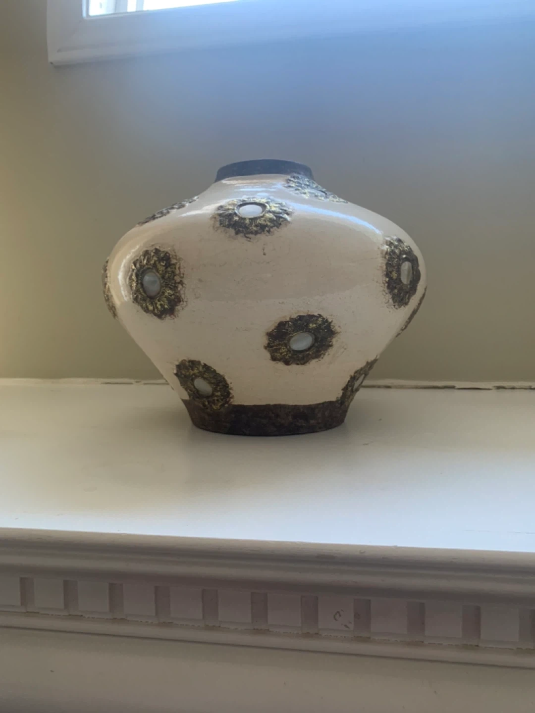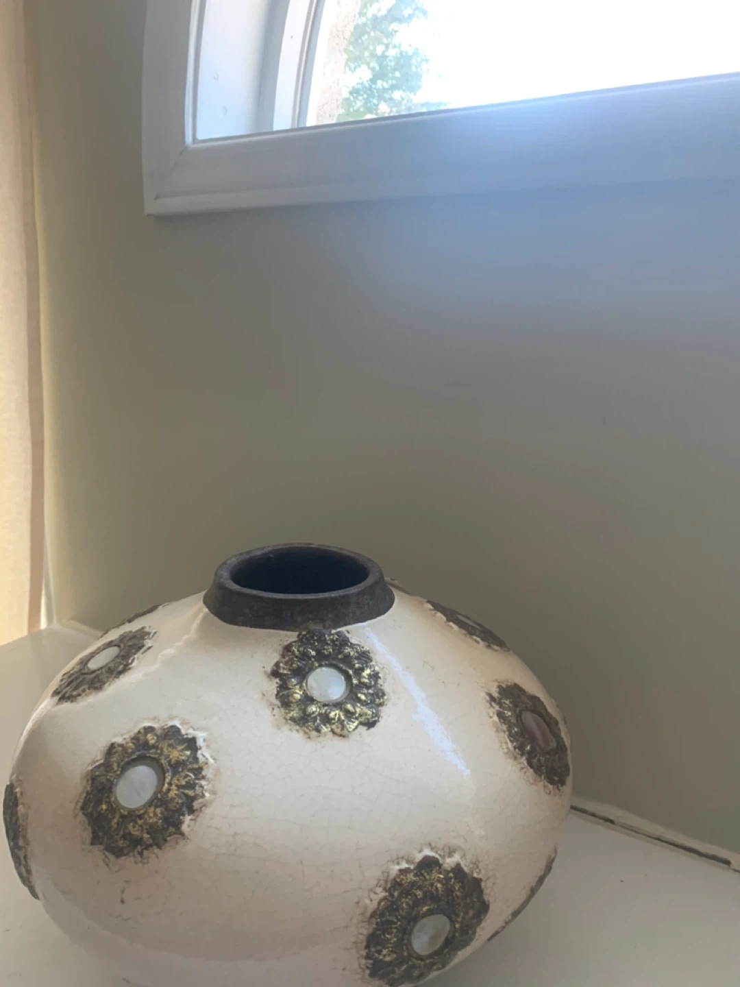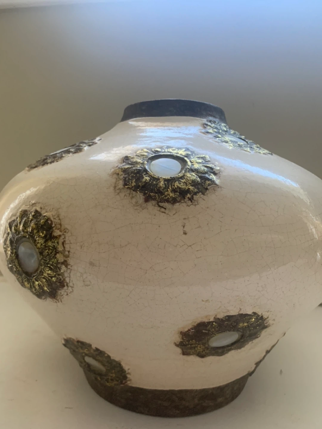 10Here's a unique decorative vase that would look great in any room! It features a cream-coloured finish with intricate gold and pearl-like accents. It would make a lovely addition to your home decor