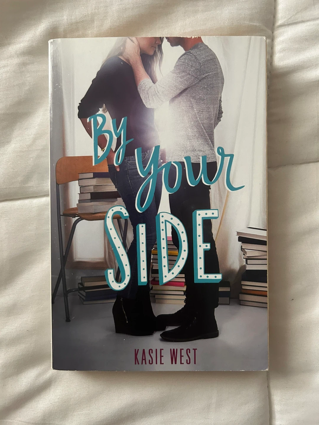 Selling the book 'By Your Side' by Kasie West! It's a cute story about finding connections in unexpected places.
