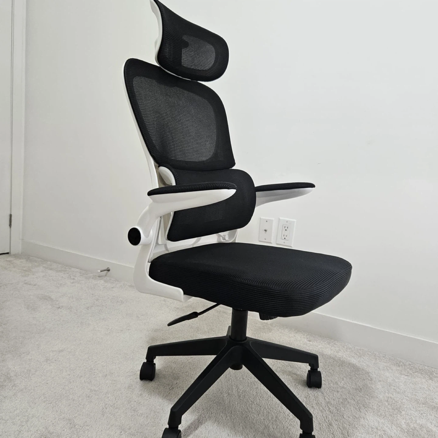 Selling a comfortable and supportive ergonomic office chair. It features a black mesh back and seat for breathability, with a white frame. Great for long workdays! Brand new only used for 1 month