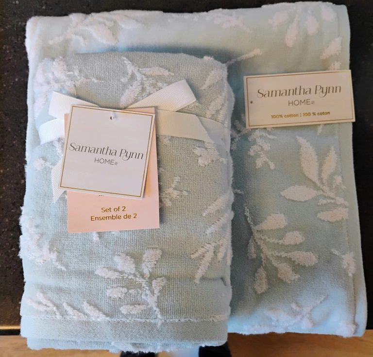 82I'm selling a brand new towel set from Samantha Pynn Home! This set includes two soft hand towels and one bath towels, perfect for adding a touch of elegance to your bathroom. Made with 100% cotton. Never used.