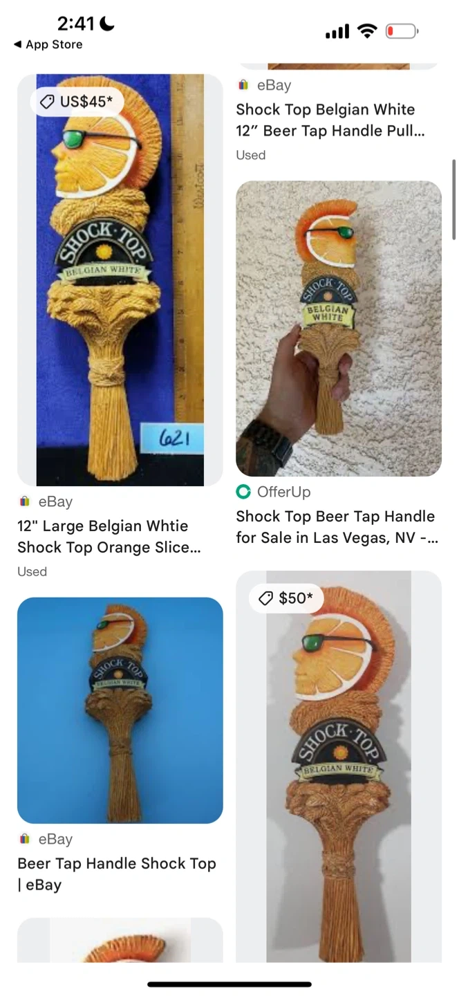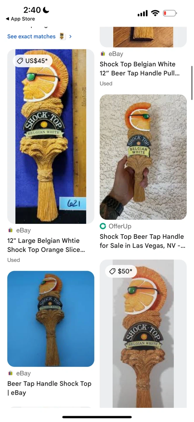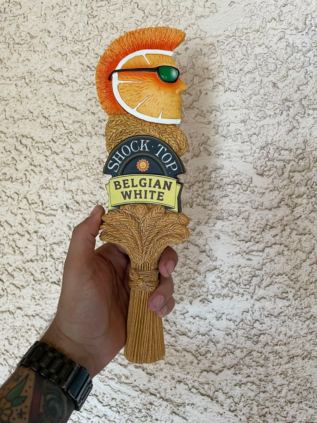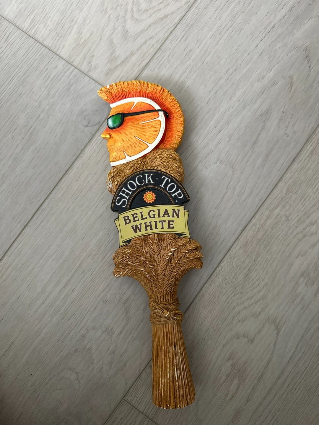 Selling a Shock Top Belgian White beer tap handle. It features a wheat and orange design with sunglasses. It's 12" tall and made of 3D resin. Great for a home bar!