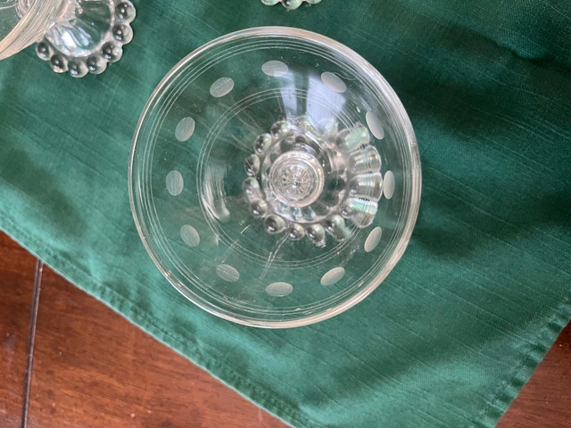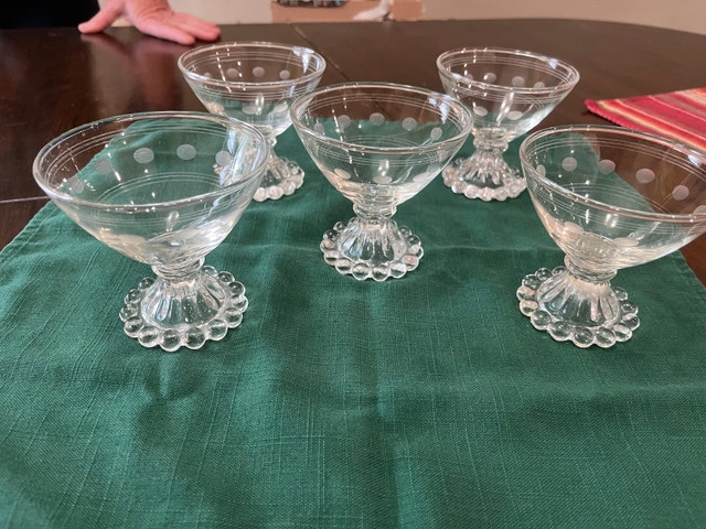 Add a touch of vintage elegance to your table setting with these charming Fostoria American clear glass sherbet dishes and matching plates. This set includes five sherbet dishes, each adorned with a delightful polka dot design, and three matching plates featuring a geometric pattern. These items have been previously enjoyed and are in good condition, ready to bring a touch of retro flair to your home. * Set includes: 5 sherbet glasses, 3 plates * Material: Clear glass * Design: Polka dot and geometric patterns If the ad's still up, dishes are still available!