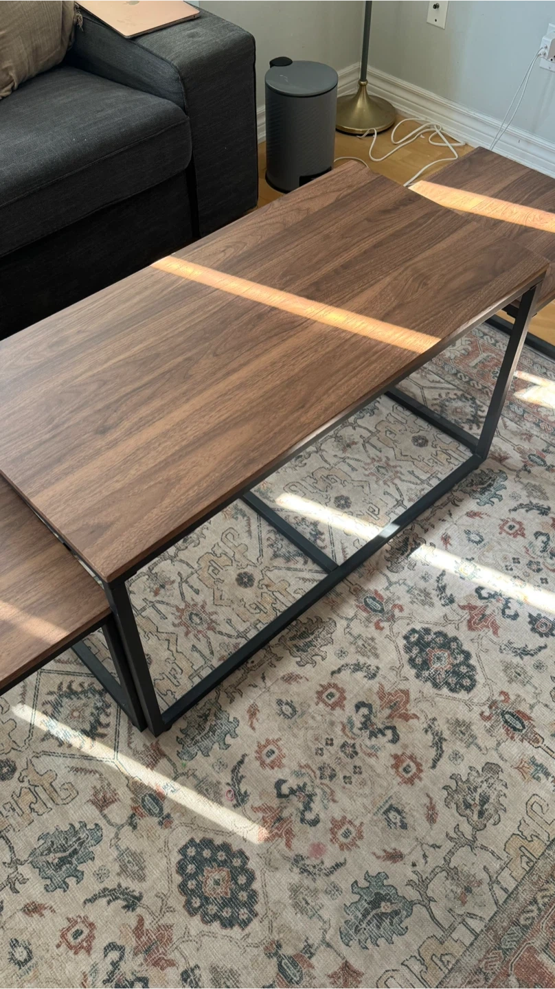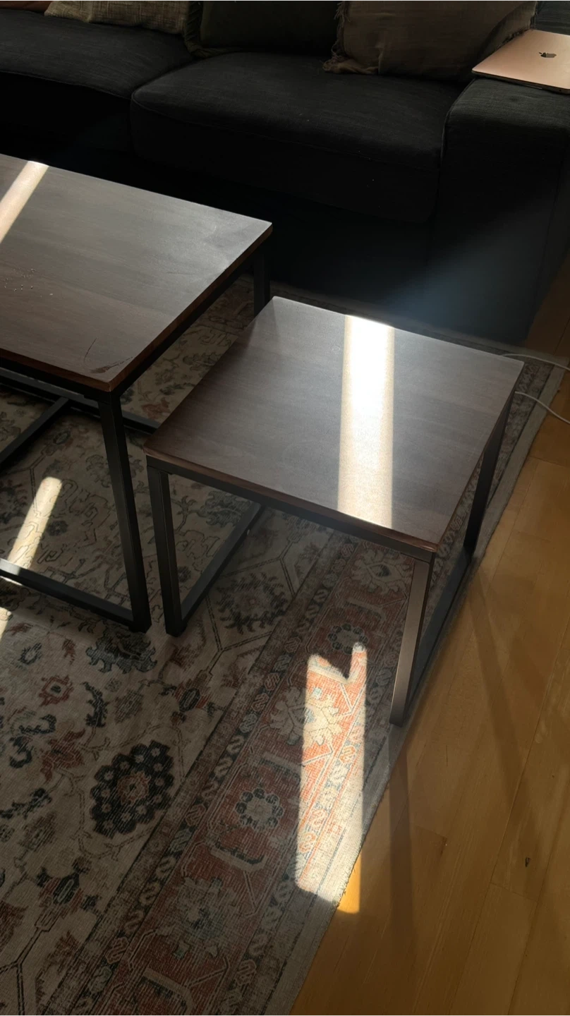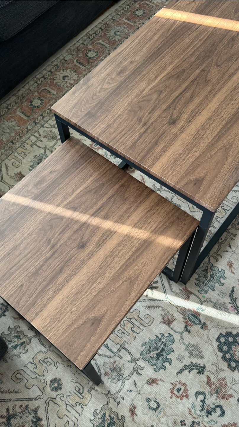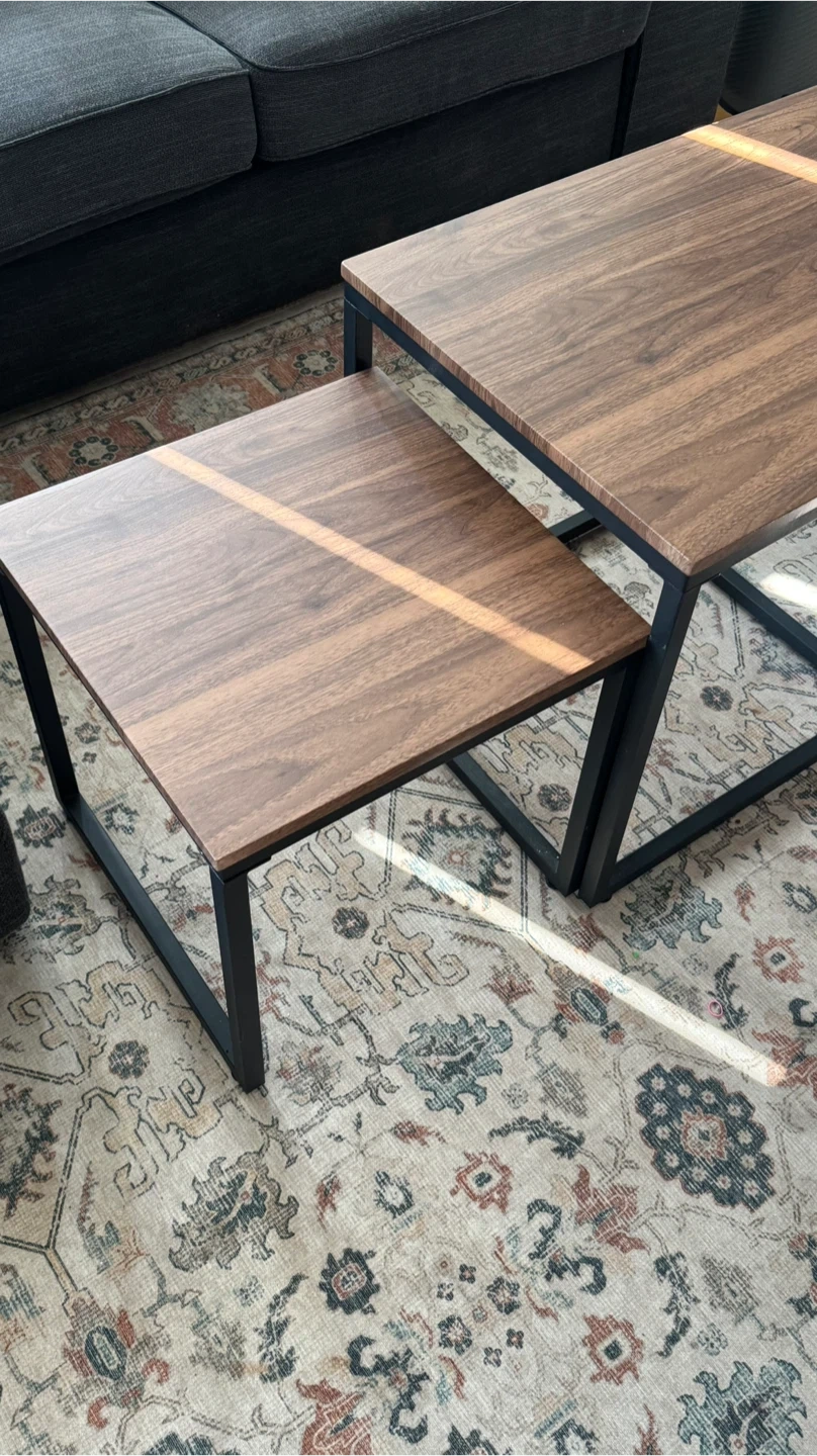 79Selling a set of three nesting coffee tables. They have a modern look with a dark wood-look top and black metal frames. Great for saving space and adding style to your living room!