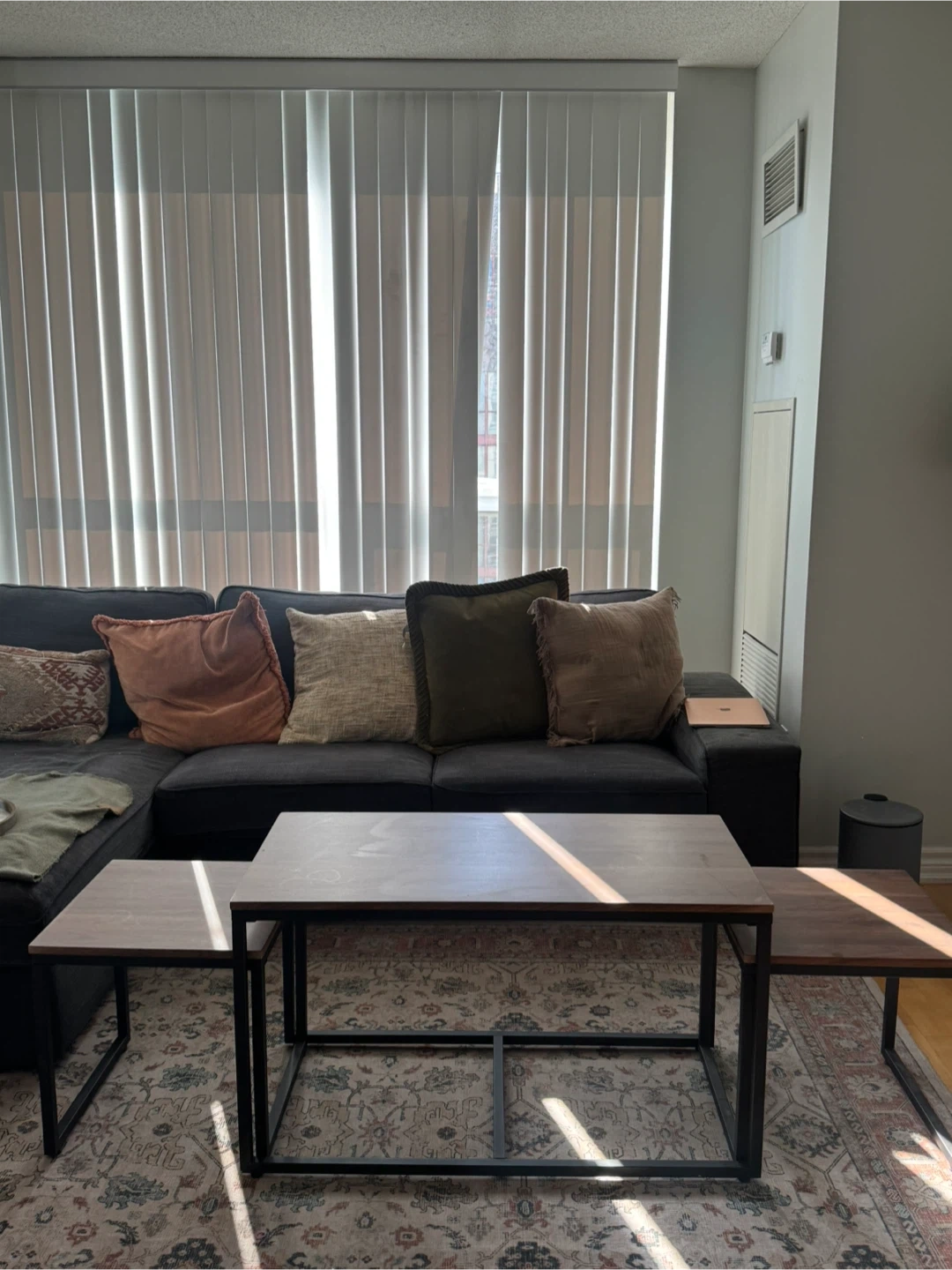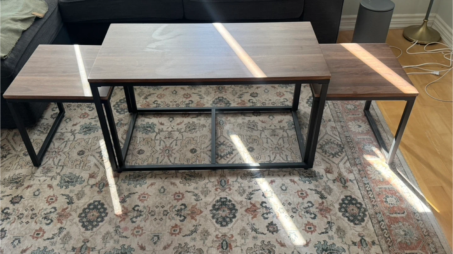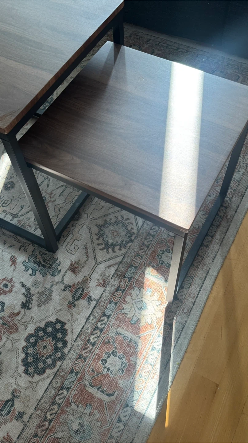 79Selling a set of three nesting coffee tables. They have a modern look with a dark wood-look top and black metal frames. Great for saving space and adding style to your living room!