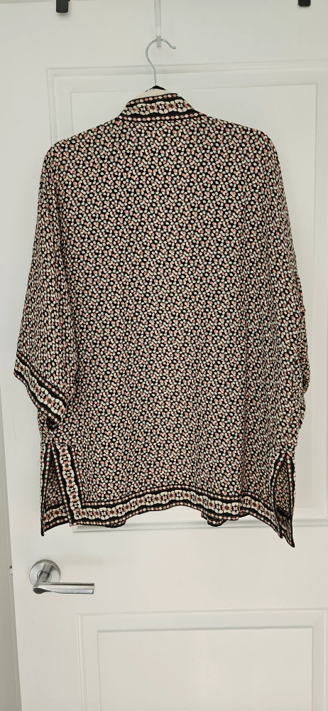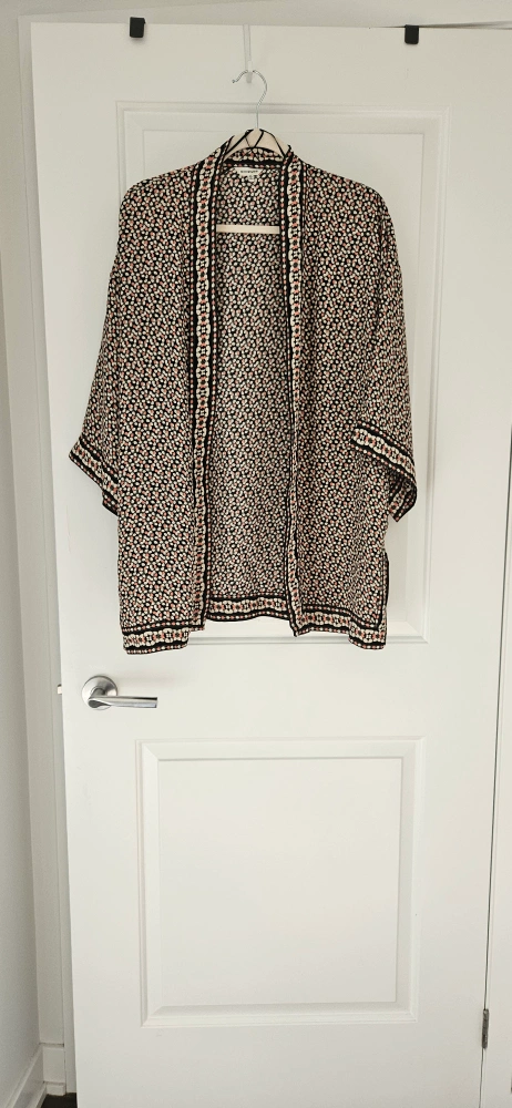 Selling a stylish Max Studio kimono in size M! The kimono features a beautiful floral pattern with black, white, and coral accents. It's perfect for layering or wearing as a light jacket. In great condition and ready for a new home