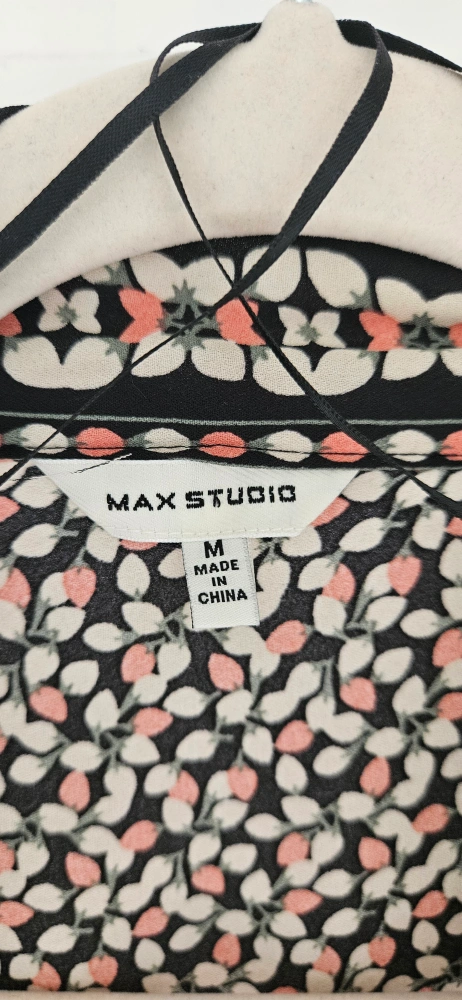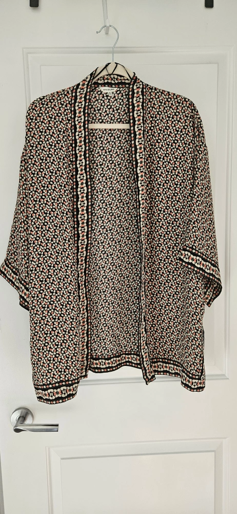 Selling a stylish Max Studio kimono in size M! The kimono features a beautiful floral pattern with black, white, and coral accents. It's perfect for layering or wearing as a light jacket. In great condition and ready for a new home