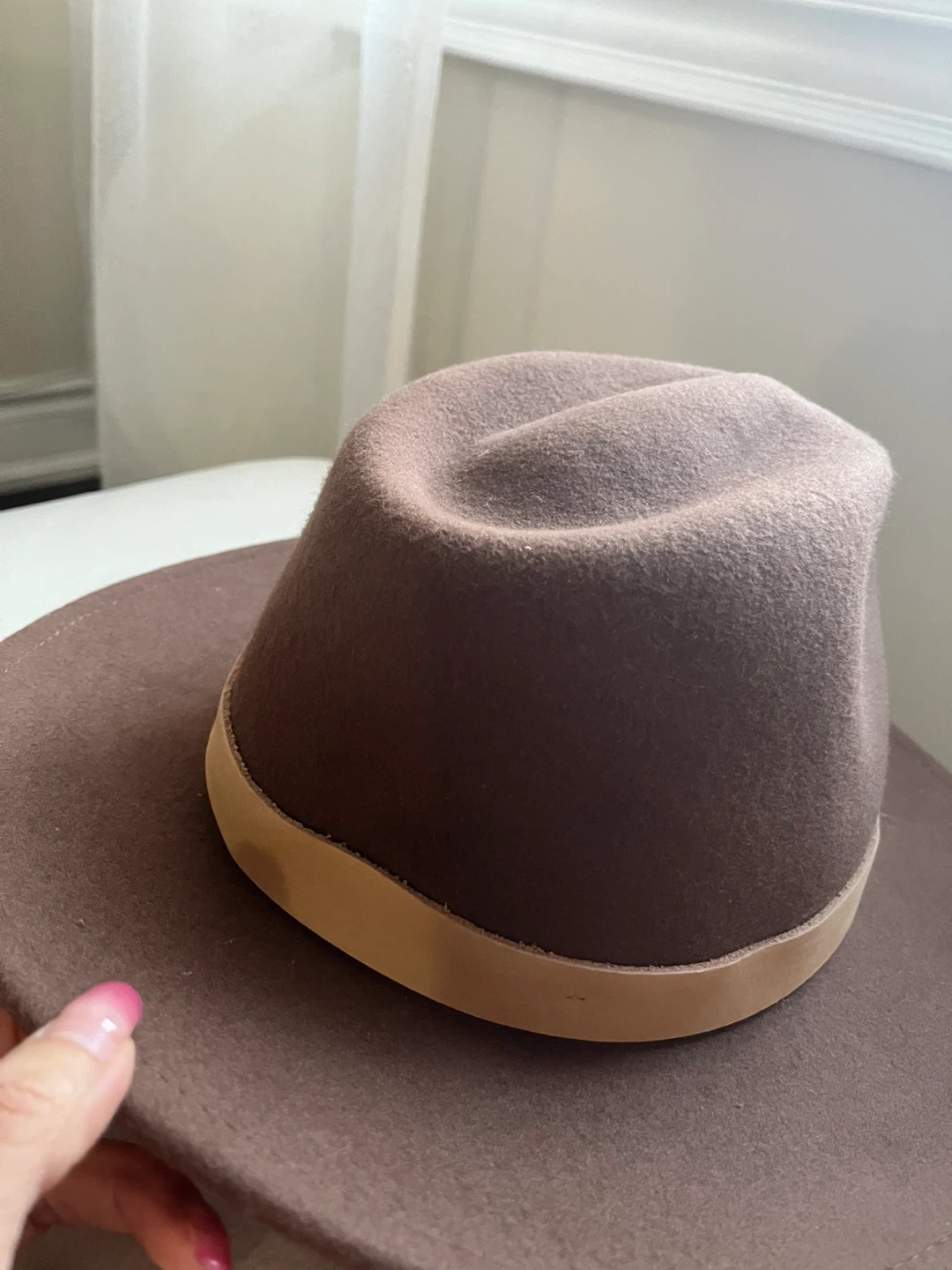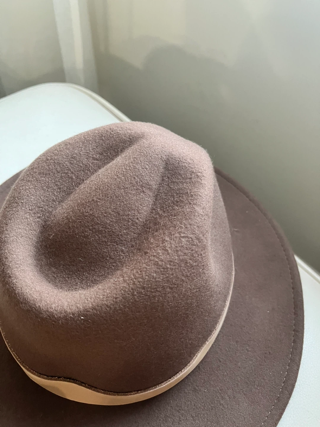 Selling a stylish brown felt fedora hat. It's in great condition and ready to add a touch of class to your wardrobe. The hat features a tan band around the base of the crown, adding a nice detail to the overall look. Perfect for any occasion!