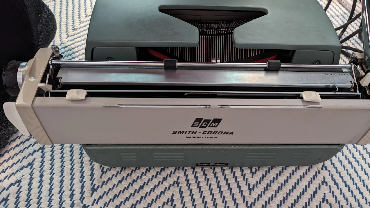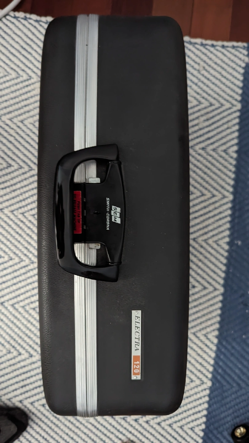Selling a vintage Smith-Corona Electra 120 typewriter. It comes with its original carrying case. This classic typewriter is in good condition. (AI written)