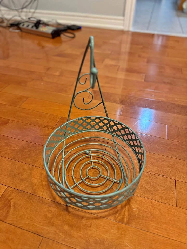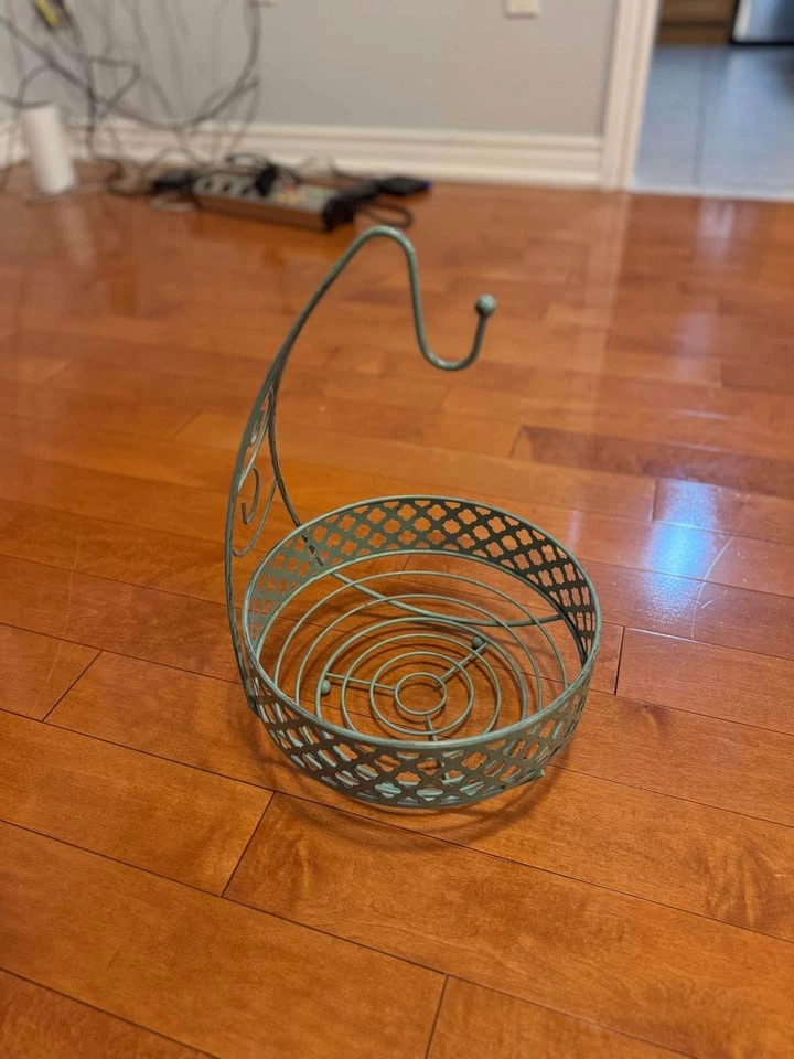 23Turquoise fruit basket. Metal material. Can hang bananas at the top.